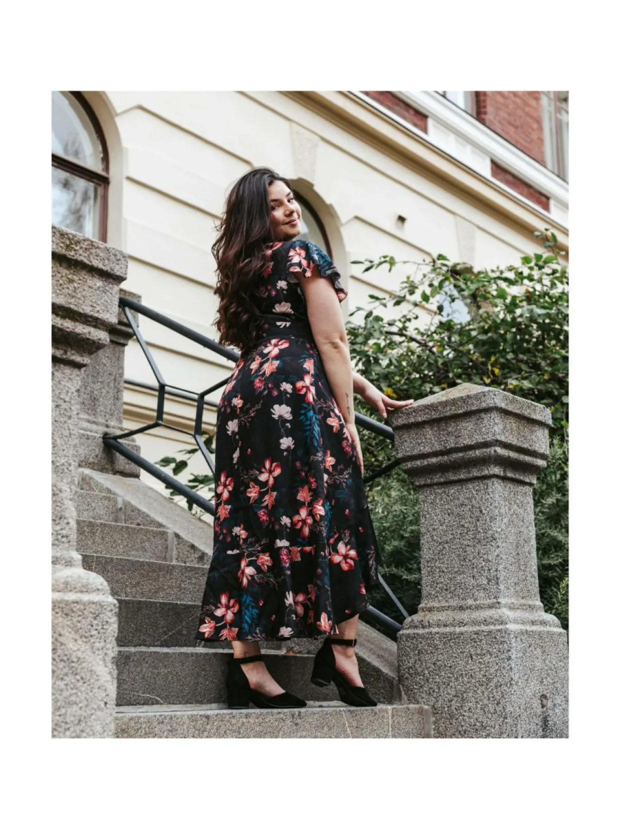 Nakoan Annika Dress on naisellinen katseenvangitsija. Valekietaisumalli ja eri tavoin solmittava vyötärönauha varmistavat istuvuuden jokaiselle vartalolle ja imartelevat muotoleikkaukset luovat kauniin siluetin korostaen juuri oikeita kohtia. Helmassa ja hihoissa toistuvat hulmuavat, aaltoilevat muotolaskokset laskeutuvat kevyellä kankaalla kauniisti. Versailles kuosin Annika mekko on vuoreton.