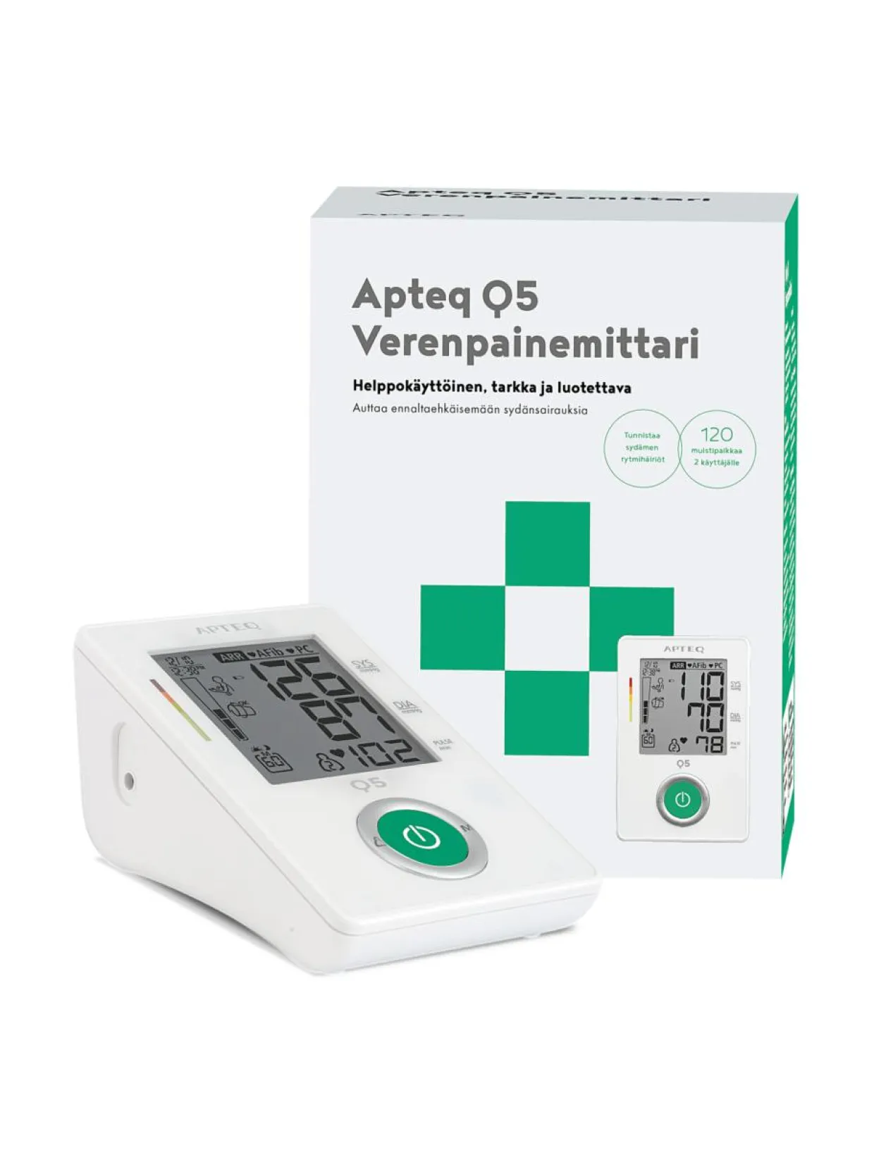 Apteq Q5 on uusi edistyksellinen täysin automaattinen olkavarsiverenpainemittari. Laitteessa on ensimmäistä kertaa maailmassa kliinisesti validoitu rytmihäiriöiden tunnistus (PARR) -toiminto.