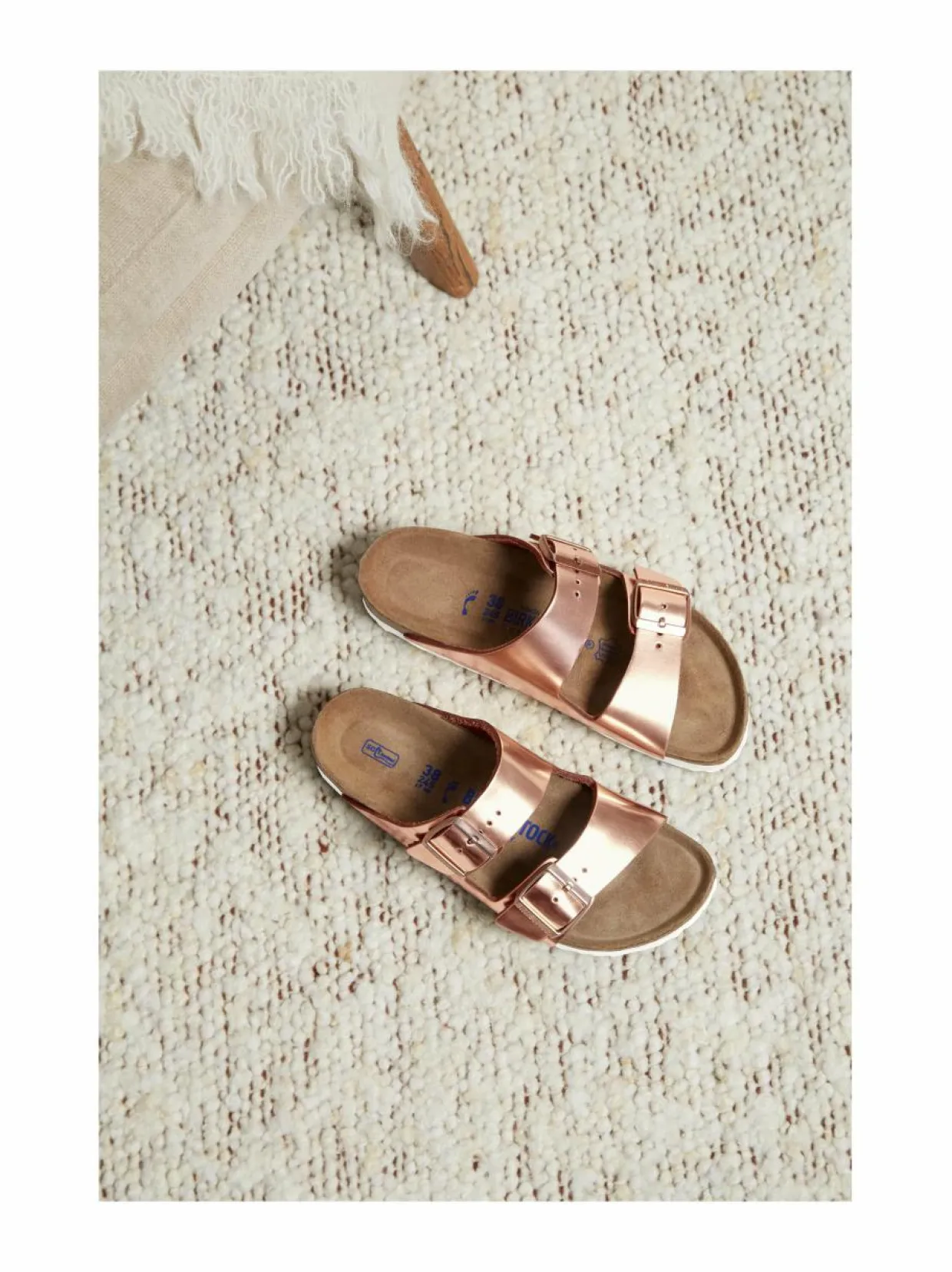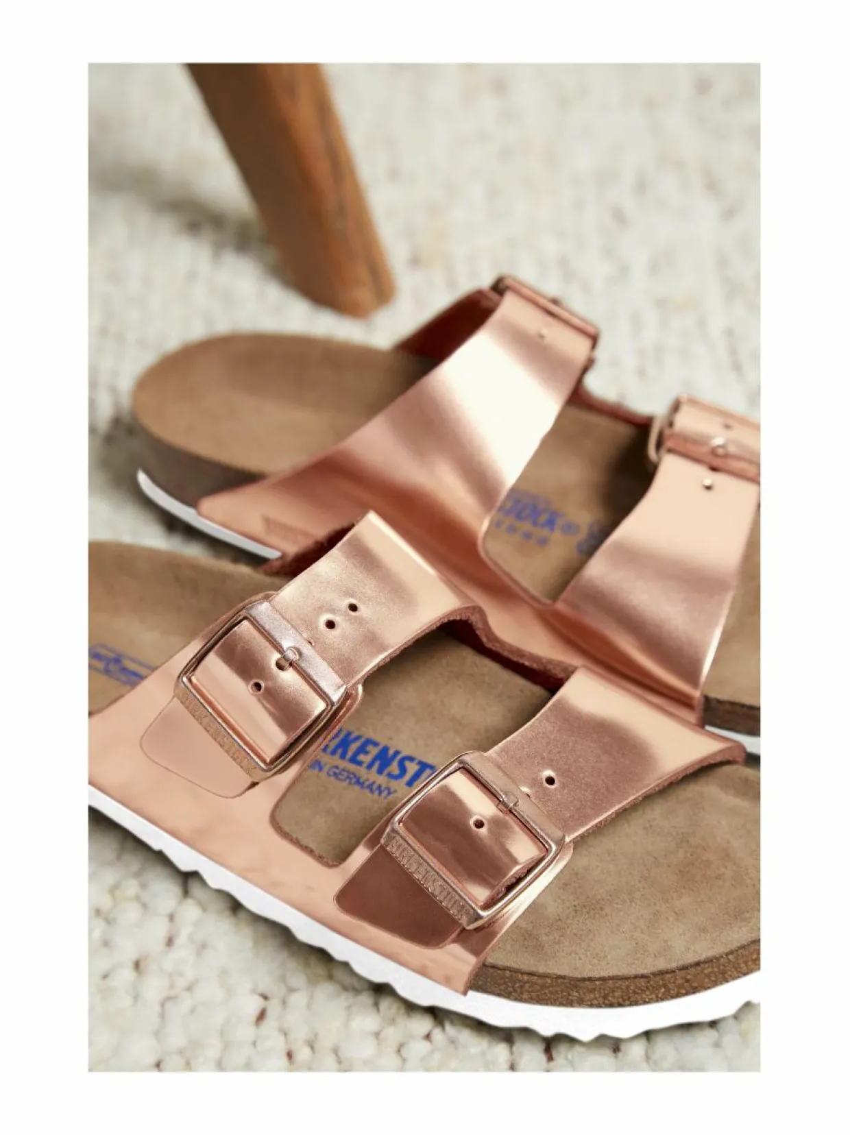 Arizona on kahdella säädettävällä remmillä ja metallisoljella varustettu minimalistinen sandaalimalli. Päällinen on laadukasta, metallinhohtoista nahkaa. Ulkopohjassa on käytetty kevyttä EVA-materiaalia, joka antaa hyvän pidon ja vaimennuksen. Pohjallinen on anatomisesti muotoiltu ja valmistettu korkin sekä lateksin sekoitemateriaalista.