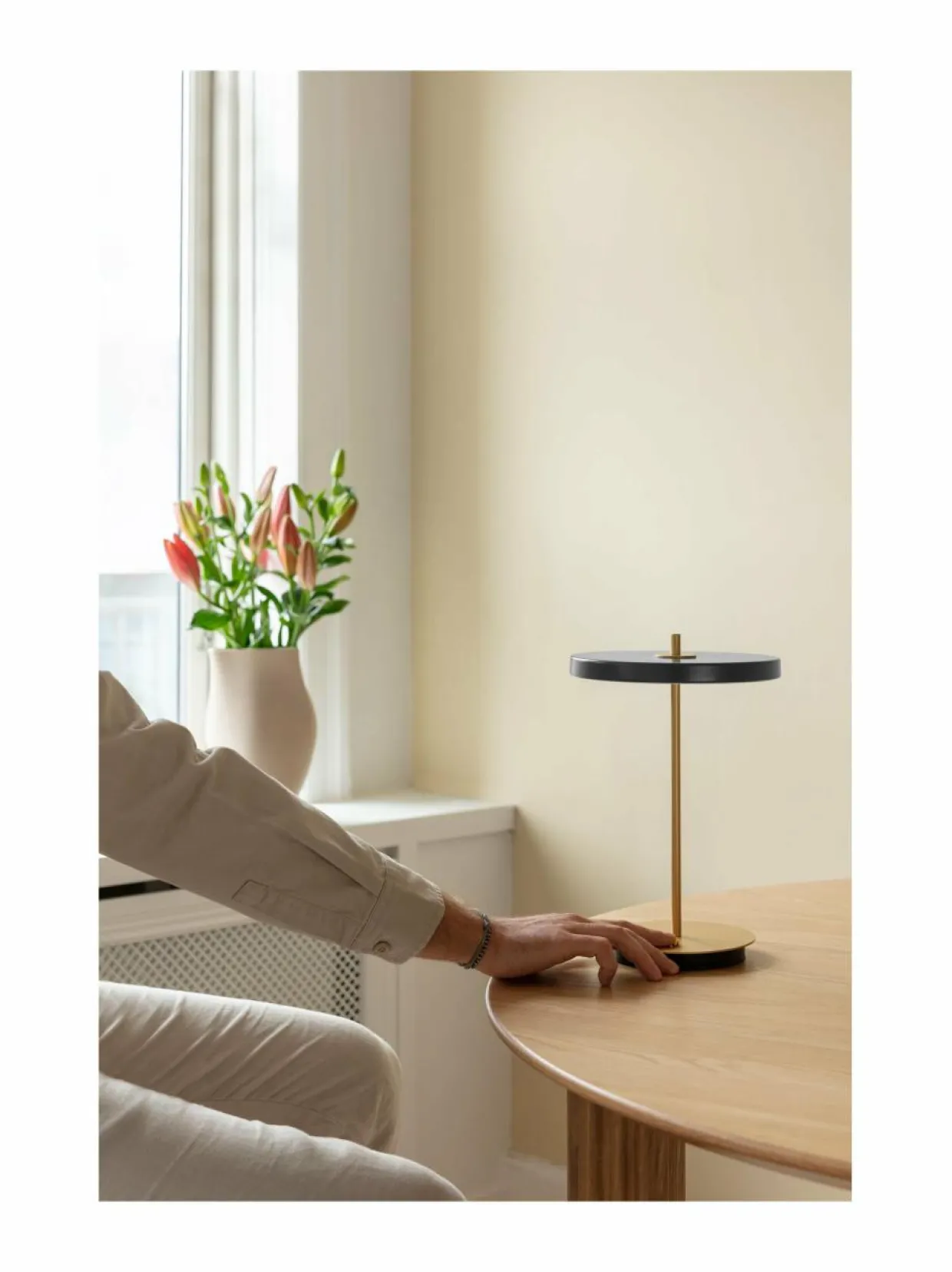 UMAGE Asteria Move -pöytävalaisimen skandinaavisen minimalistinen muoto on saanut innoituksensa tähdenlennosta. Kiinteän LED-lampun valo siivilöityy tasaisesti pehmeän valkoisen diffuusorin lävitse