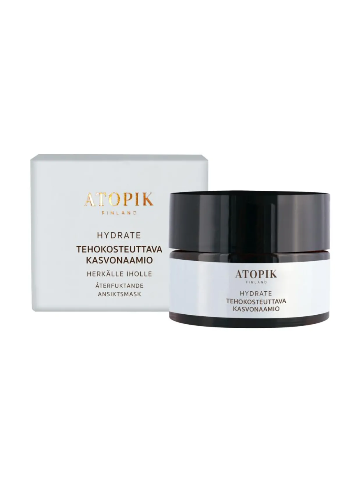 ATOPIK Hydrate Tehokosteuttava kasvonaamio on Hydrate-linjan kosteuttava helmi, joka suo välitöntä ja merkittävää helpotusta kuivuuttaan kiristelevälle iholle. Lactobacillus-fermentoitu suomalainen kaura ja hyaluronihappo saavat ihon tuntumaan pehmeältä, heleältä ja kimmoisalta. Sinkkioksidi rauhoittaa ihoa ja prebiootit tukevat ihon hyvinvointia. Sopii tehokosteutukseksi kaikille ihotyypeille. Dermatologisesti testattu.
