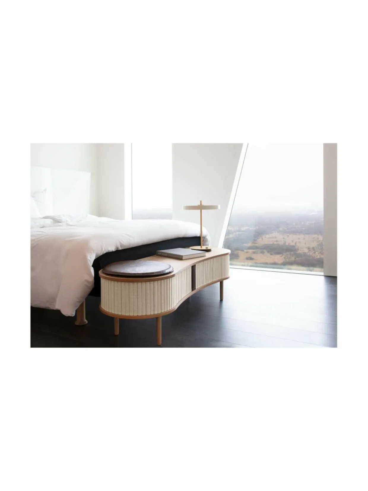 Tanskalaisen Jonas Søndergaardin suunnittelema Audacious TV-tasoa luonnehtivat sen pehmeä muotokieli ja funktionaalinen design. Se piilottaa itseensä siististi kaikki johdot – takana on reikä johtojen läpivientiä varten. Sen päällä voi myös istua, joten voit asettaa sen myös vaikkapa eteiseen ja istua sillä, kun puet kenkiä. Tasossa on rullaovet, jotka liukuvat päätyjen yli niitä siirrettäessä. Voit määritellä mielesi mukaan, kuinka paljon tason sisustaa on kerralla näkyvissä, siirrellen ovia.