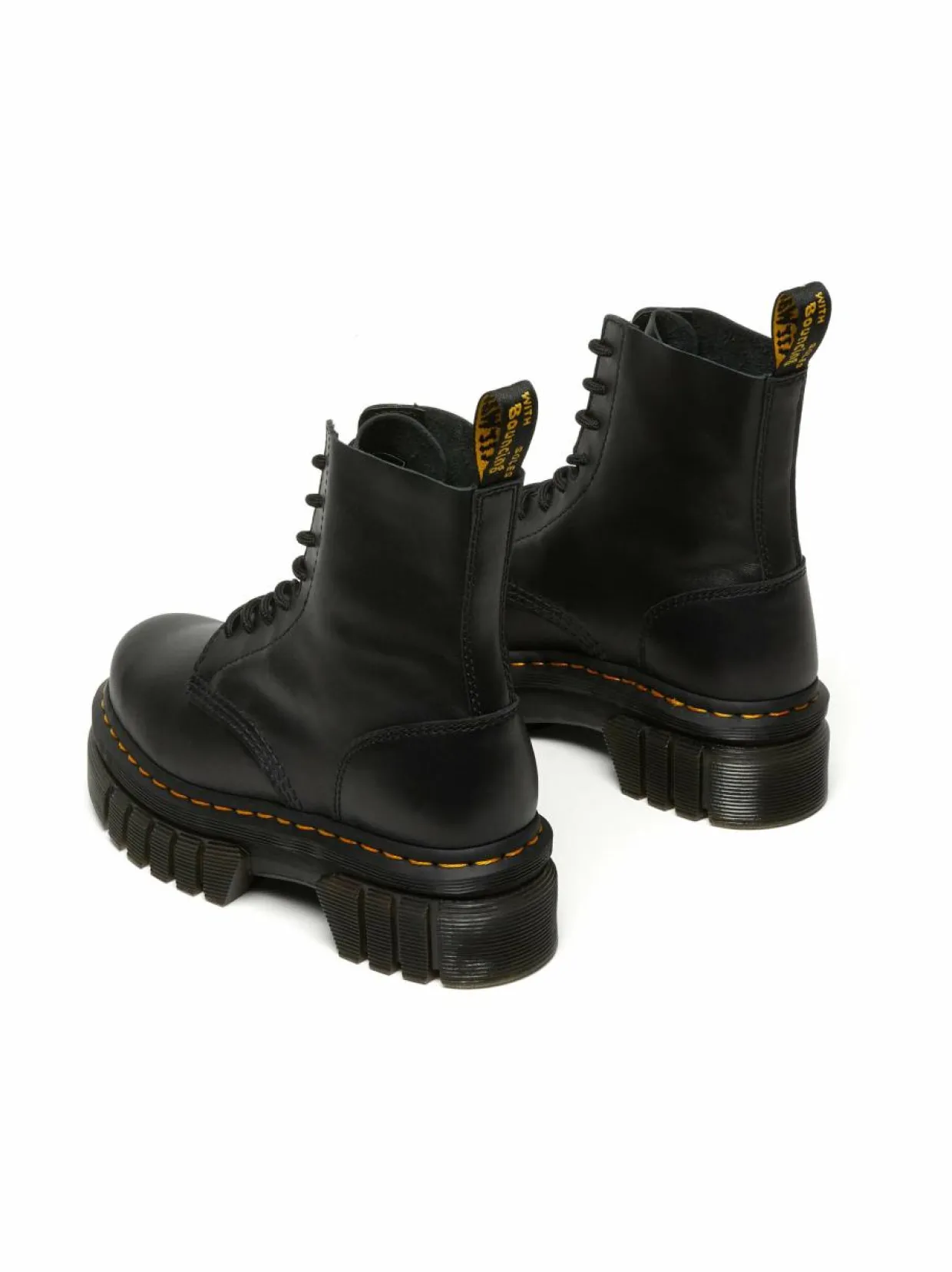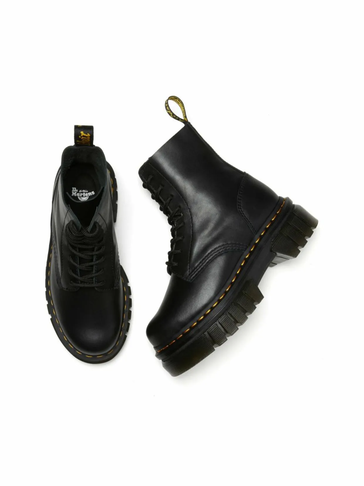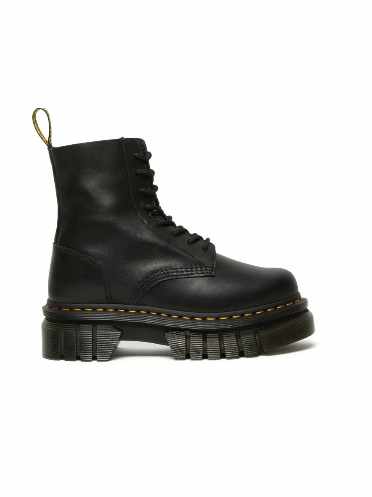 Korkealle kohoava platform-pohja. Arkikäyttöön. Nämä uudet, kevyen rakenteen omaavat maiharit istuvat paksun Quad-pohjan päällä. Jalkineissa on innovatiivinen kaksiosainen pohja – kevyt EVA-keskipohja ja PVC-ulkopohja, jossa on särmikkään syvät kiinnikkeet. Vähemmän painoa, enemmän asennetta. DM:t täydellä volyymilla. Maiharit on pakattu täyteen Dr. Martensin DNA:ta. Ne on viimeistelty DMS-kuvioinnilla, keltaisella pohjatikkauksella ja kirjaillulla AirWair-kantapäälenkillä.