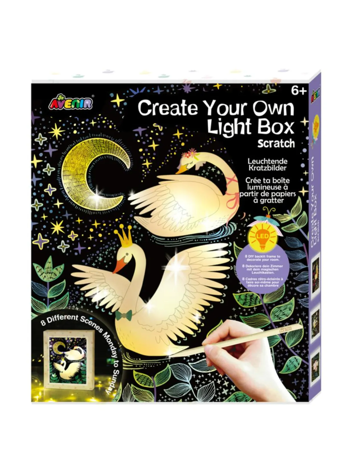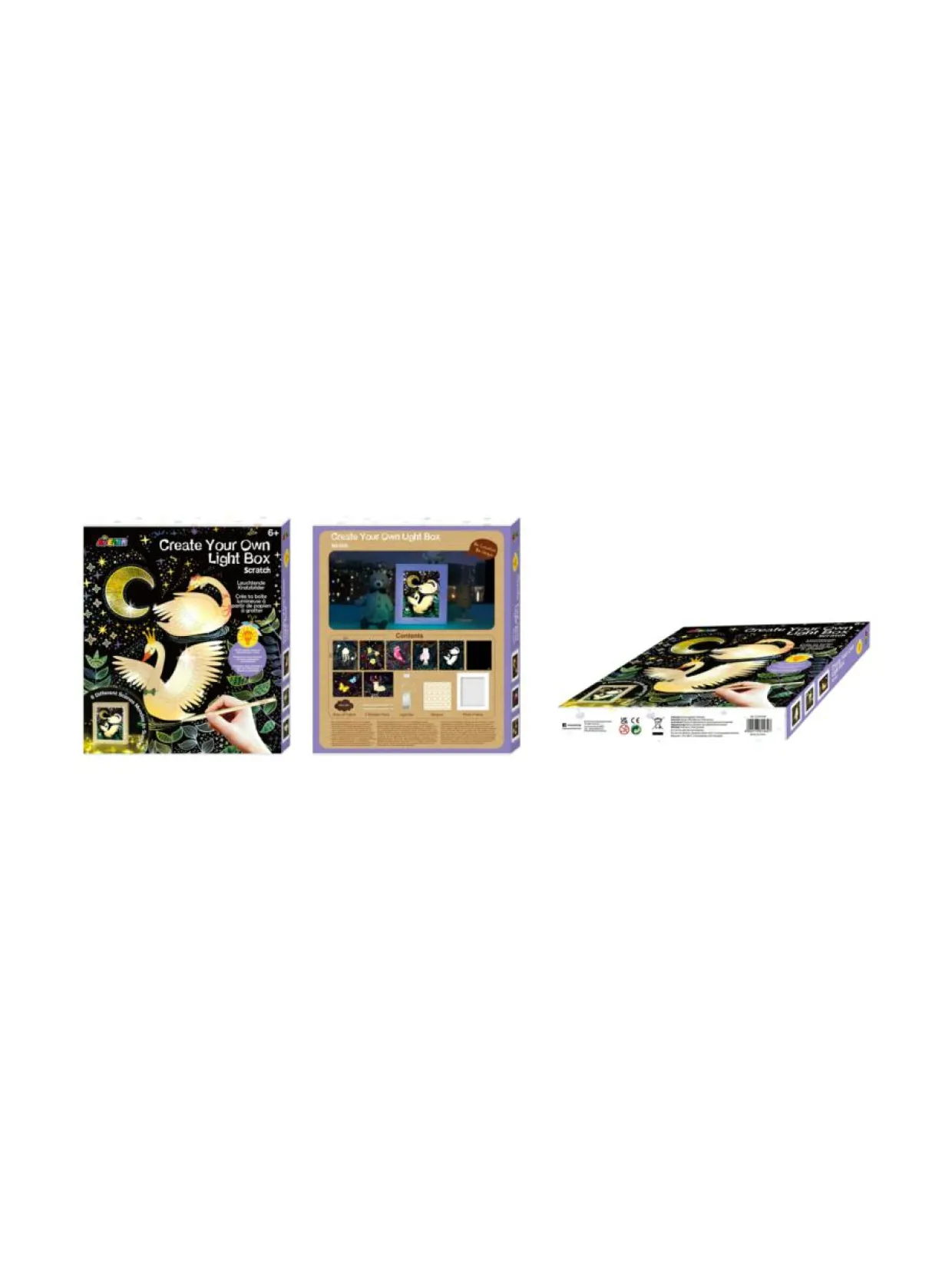 Tee huoneeseesi kaunis, itse suunniteltu valolaatikko, jossa on 8 erilaista kuvaa, joista valita! Ole luova, ole ainutlaatuinen! Laatikosta tulee valolaatikon kehys. Pakkaus sisältää upeat keijuvalot raaputustaiteesi taustavaloksi. Valittavana on 8 mallia – joutsenet, pöllöt, linnut, perhoset, peura, meduusat, tulikärpäset sekä tyhjä kortti, johon voit toteuttaa omia ideoitasi. Ikäsuositus: 6-vuotiaille ja sitä vanhemmille lapsille. Mitat 4,5 x 24 x 28 cm.