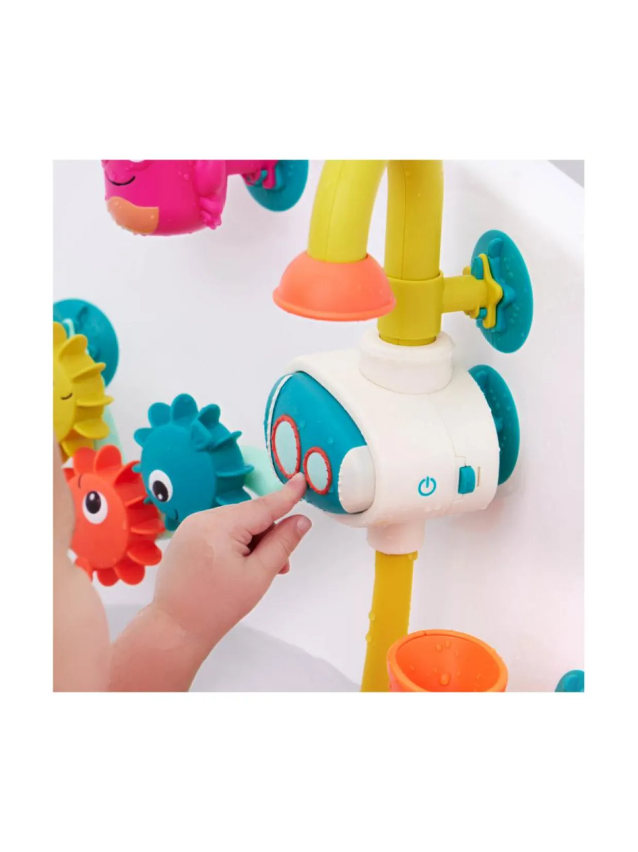 Pumppaa kylpyaika seuraavalle tasolle ja anna hauskanpidon virrata B. toysin Wonder-full Waterworks -leikkisetin avulla! 7-osainen, sukellusveneaiheinen kylpylelusetti sisältää vesipumpun, joka imee vettä ammeesta ja valuttaa sen takaisin ammeeseen pienen hanan kautta. Mutta siinä ei ole vielä kaikki! Ihmeellinen kylpylelu sisältää mustekalasuppilon, vesikupin, ravun näköisen kupin, 3 pyörivää kalan näköistä hammasratasta, pyörivän meritähden ja vesiputken. Kylpylelu pumppaa vettä automaattisesti, kun käytät paristokäyttöistä pumppua tai voit pumpata vettä manuaalisesti sukellusveneen painikkeen avulla. Kun vesi virtaa, lapset rakastavat muunnella kylpylelua ja muuttaa niin veden virtausta. Kaikki osat voi kiinnittää kätevästi ammeen kylkeen imukupeilla! Kun lapset leikkivät kylpylelulla, he kehittävät samalla hienomotorisia taitojaan ja harjoittelevat ongelmanratkaisua. Tuotetta suositellaan yli 10 kuukauden ikäisille lapsille. Tuote toimii paristoilla, jotka sisältyvät toimitukseen.