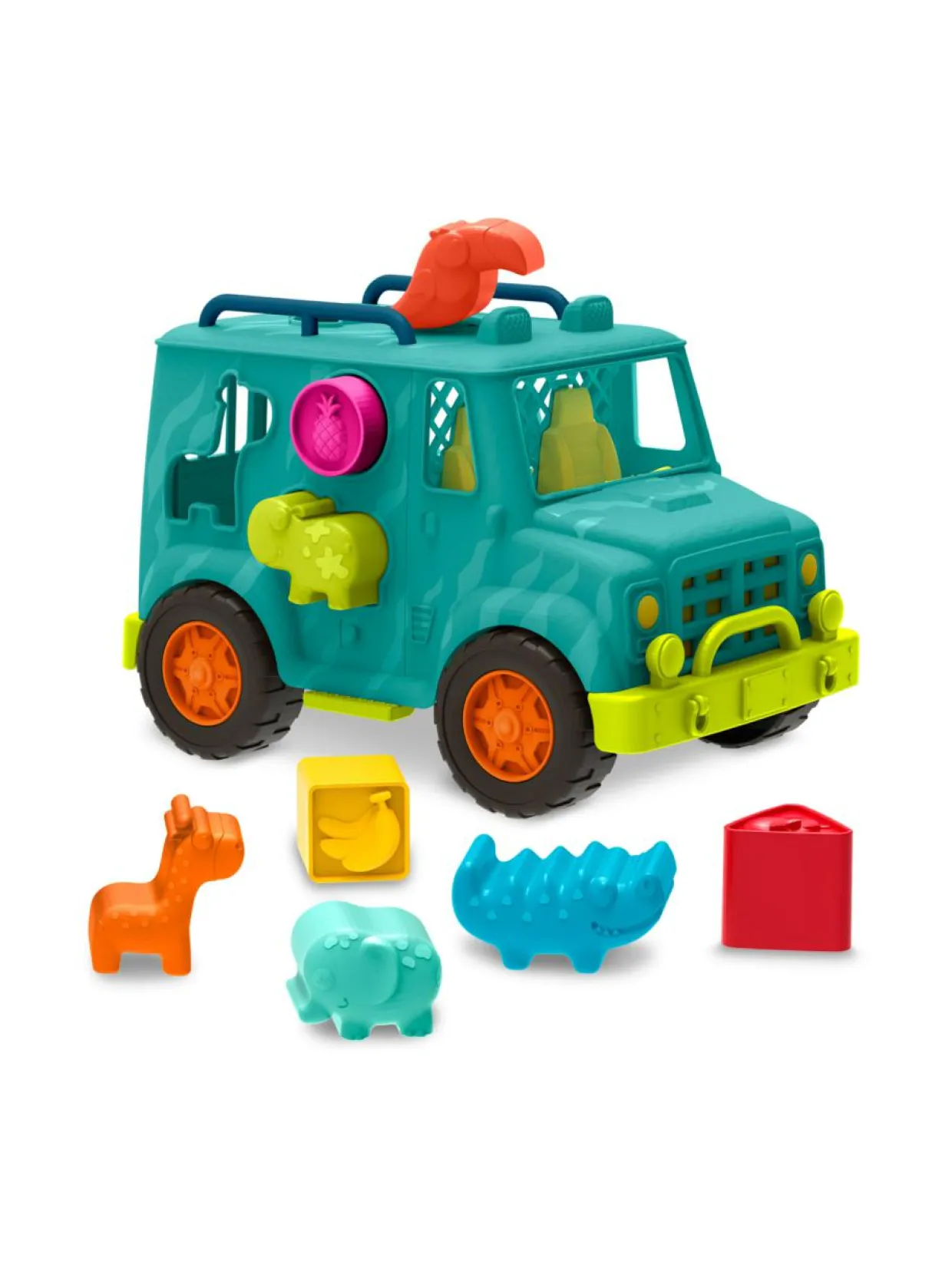 Aloita lajitteleminen B. Toysin Eläintenpelastusrekan avulla! Tämä opettavainen lelu auttaa lapsia kehittämään lajittelu-, yhdistely- ja laskutaitojaan samalla, kun he oppivat eläimistä, hedelmistä, muodoista ja väreistä. Taaperot voivat lajitella, sovittaa yhteen, kaahata leikkisavannilla ja pelastaa eläinystävänsä rekan kyytiin matkan varrelta. Kaikki setin osat sopivat hyvin lasten pieniin käsiin ja rekan pyörät rullaavat pehmeästi jättäen lattiat naarmuttomiksi. Lisäksi leikkiminen tällä lelulla edistää luovuutta, kehittää hienomotorisia taitoja ja parantaa silmän ja käden koordinaatiota. Aja, lajittele ja leiki hyvällä omallatunnolla, koska pelastusrekka on täysin kierrätettävä! Leikkiauto on osa Happy Cruisers -sarjaa, johon kuuluu erilaisia värikkäitä ja lapsiystävällisiä leluautoja.