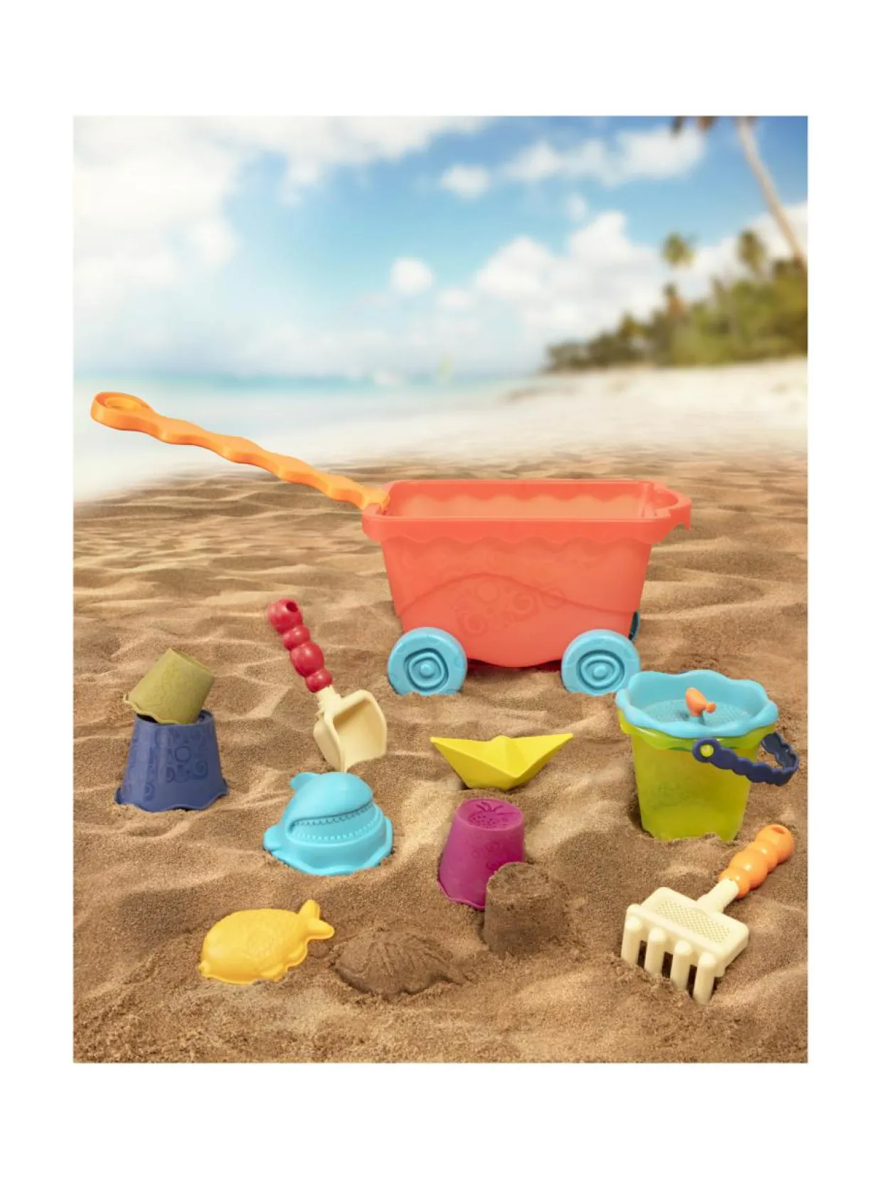 Valmiina valloittamaan hiekkarantaa! Kuljetusvaunu kaikille hiekkaleluille, jotka tarvitset mukaasi rannalle, telttailemaan tai hiekkalaatikolle. Mukana 11 iloisenväristä hiekkalelua. Vaunu on helppo vetää mukana mukavasta kahvasta. 11 kivaa hiekkalelua: 1 rantavaunu, 1 ämpäri, 1 siivilän kansi, 3 merieläimen muotoista kuppia, 1 hai -kansi , 1 kalanmuotoinen hiekkamuotti, 1 laiva, 1 harava ja 1 lapio.