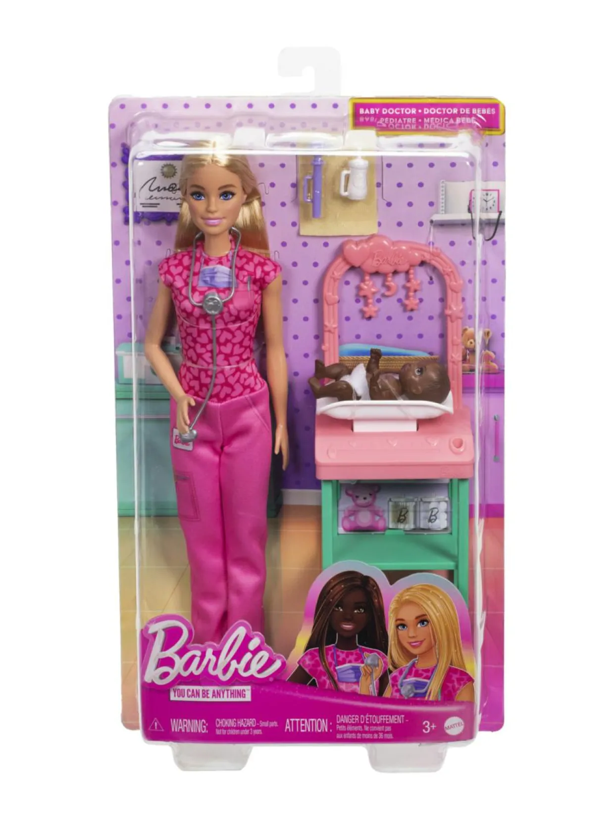 Söpö ja leikkisä nukkesetti, joka tutustuttaa lapset terveydenhuollon maailmaan. Setti sisältää vaaleatukkaisen Barbie-lääkärinuken, jolla on vaaleanpunainen lääkärin asu. Settiin kuuluu myös pieni vauvanukke vauvan tarvikkeineen ja huonekaluineen. Ikäsuositus 3+