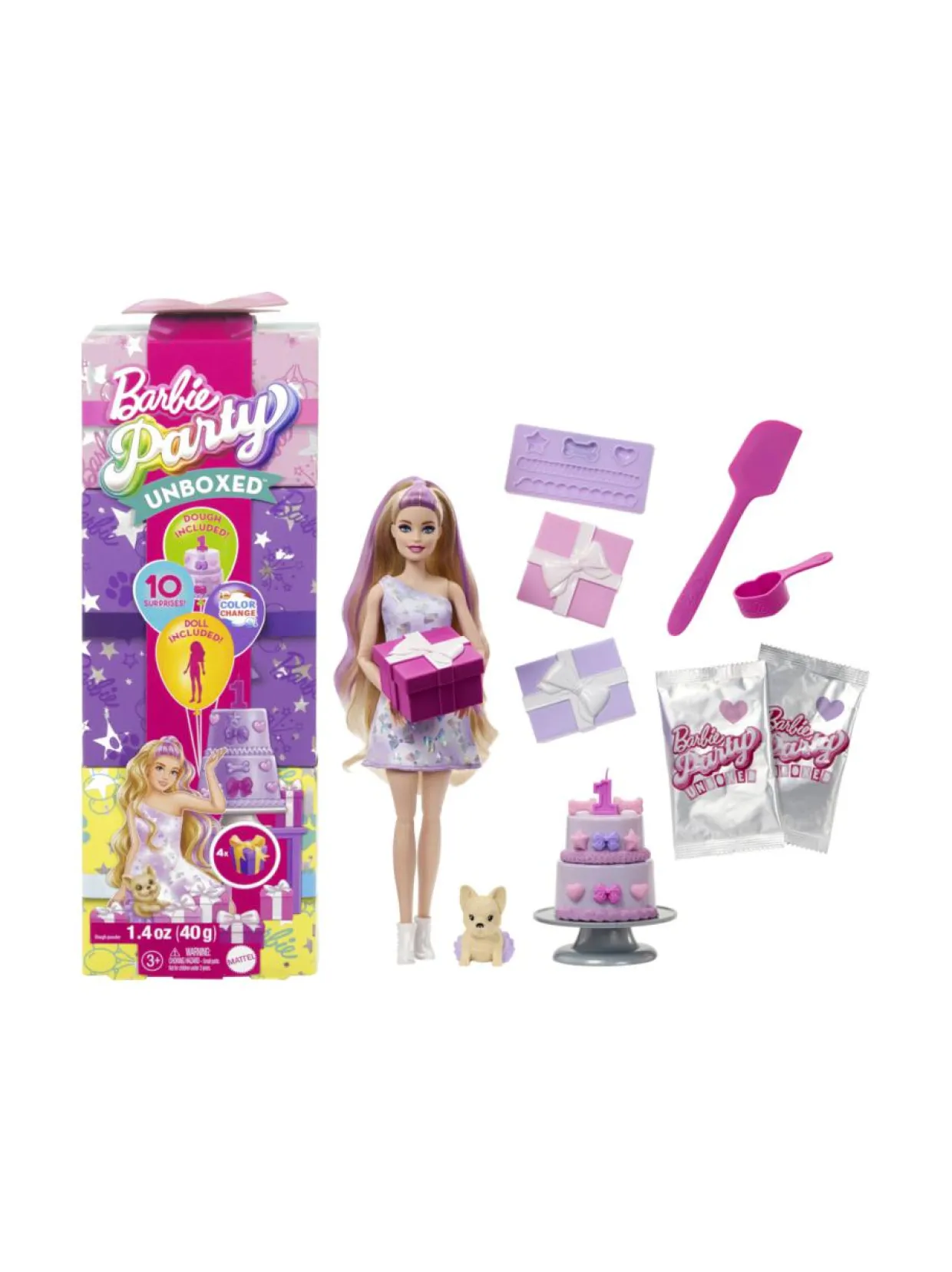 Löydä hauska ja yllättävä Barbie Party Unboxed Reveal -syntymäpäiväyllätysnukke! Tämä setti sisältää: Barbie Party Unboxed -nuken, lemmikin, asusteet, kakun ja koristelutarvikkeita. Barbien ja hänen lemmikkinsä värinvaihtotehosteet lisäävät leikkiin hauskuutta. Käytä mukana tulevia tarvikkeita oman syntymäpäiväkakun luomiseen ja koristele se mielikuvituksesi mukaan!