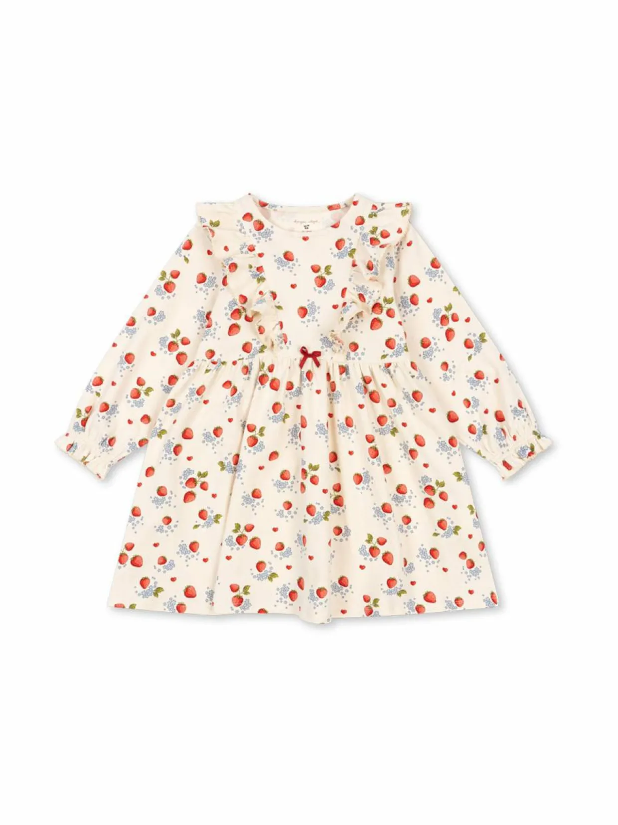 Ihastuttava Basic Frill -mekko on valmistettu pehmeästä ja hengittävästä luomupuuvillasta. Mekko on varustettu kauniilla pitsillä reunustetulla rypytyksellä edessä ja selässä. Mekossa on pitkät hihat ja se on suunniteltu a-linjaiseksi. Mekko sopii täydellisesti arkeen ja juhlaan. Mekko on valmistettu GOTS-sertifioidusta luomupuuvillasta, mikä takaa sen ympäristöystävällisyyden ja turvallisuuden. Luomupuuvilla on pehmeää ja miellyttävää iholle.