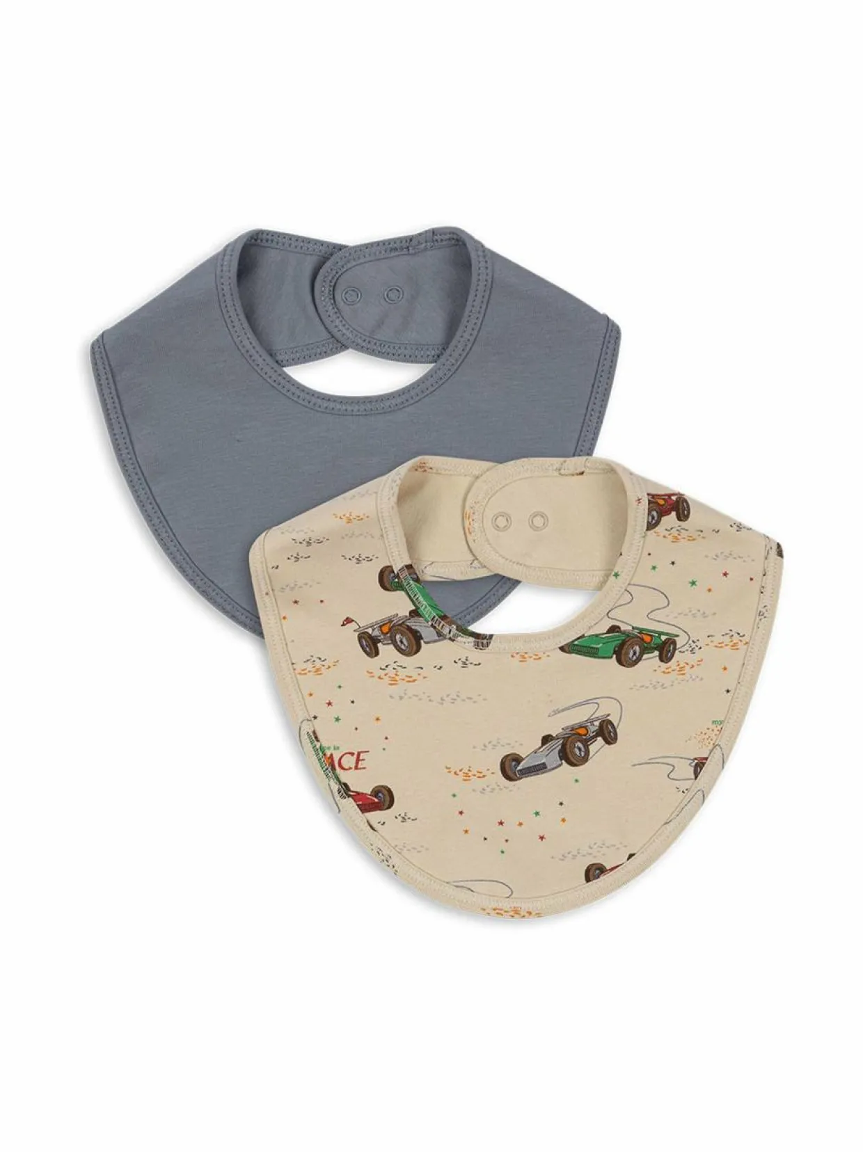 Konges Sløjd merkin ruokalaput, joissa on kaksi painonapitettua säätötasoa. Valmistettu pehmeästä ja ihoystävällisestä luomupuuvillasta. Pakkauksessa on kaksi ruokalappua, josta toinen on yksivärinen ja toisessa on printti.
