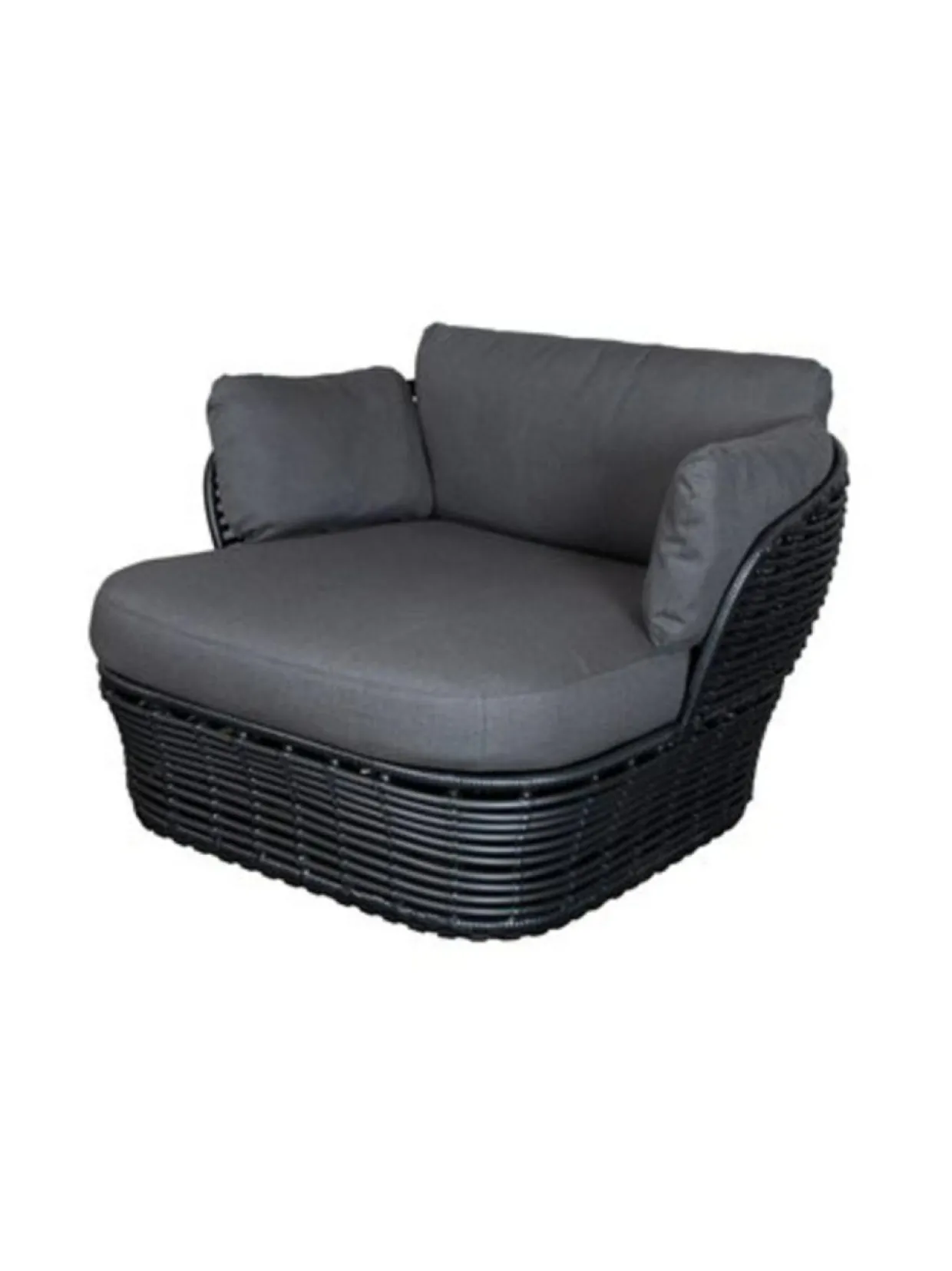 Basket-nojatuoli ulkokäyttöön. 110 cm lev, 100 syv, 70 kork, 40 istuinkork. Muhkea ja mukava Cane-Line Air Touch harmaa tyynysetti sisältyy hintaan. Grafiitin värinen Cane-line Weave® -punosmateriaali, pulverimaalattu teräsrunko.
