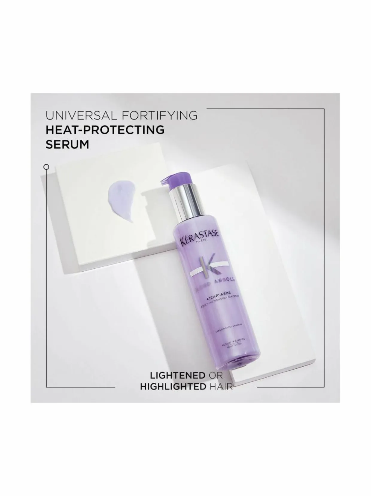 Hohtava laventelinsävyinen hiuksiin jätettävä Kérastase-hoitoaine, joka vahvistaa herkistyneitä vaalennettuja, raidoitettuja tai harmaita hiuksia. Hyaluronihappoa ja alppitähteä sisältävä Cicaplasme sinetöi haaroittuneet latvat ja silottaa hiussäikeitä antaen tasaiselta tuntuvan lopputuloksen ja pitkäkestoisen suojan pörröisyyttä vastaan. Se hoitaa hiussäikeiden vaurioituneita osia välittömästi. Cicaplasme antaa hiuksille lämpösuojan jopa 230 asteessa lämpömuotoilulaitteita käytettäessä. Hiukset ovat pehmeät ja säihkyvät.