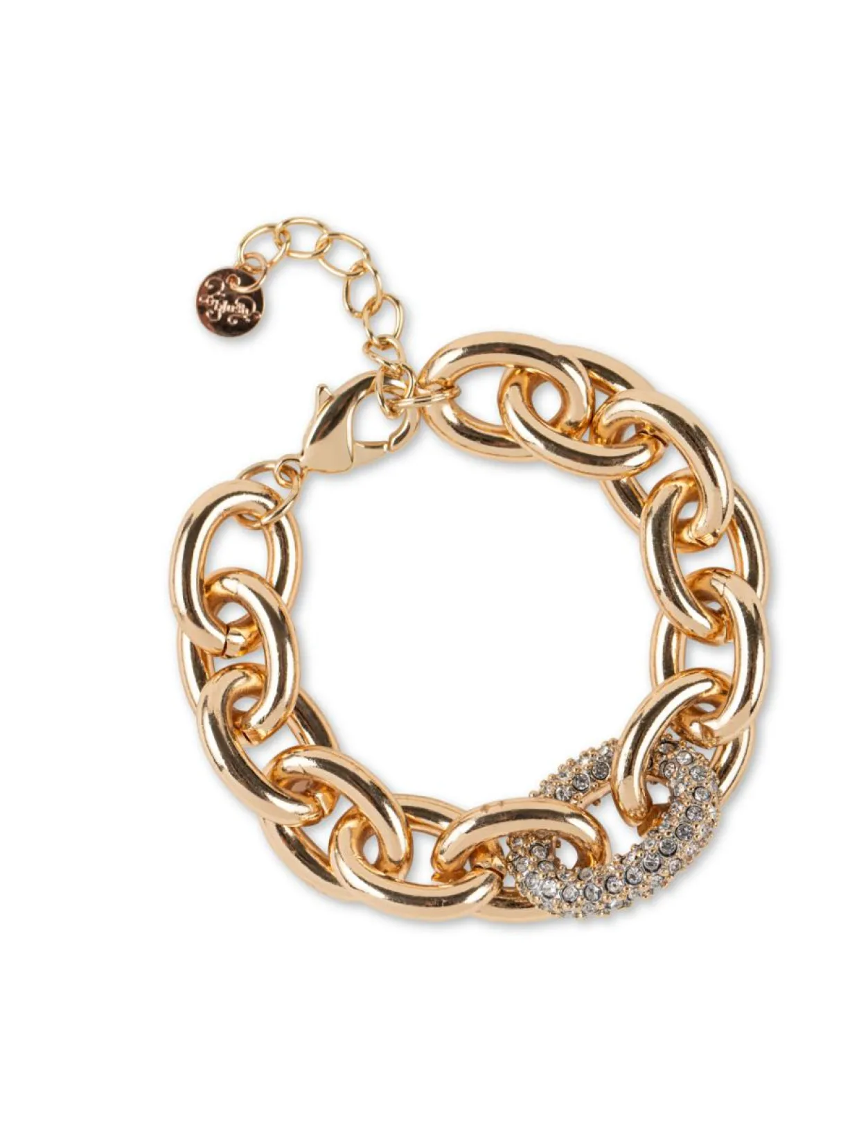Paksu 18K kullattu rannekoru, jossa keskellä oleva keskilenkki on täynnä kimaltelevia lasikiteitä. Pituus on 18 cm ja siinä on pieni lisäketju, joka on 3,5 cm, joten voit säätää pituutta käsivarteen mukaan. Keskellä olevan kidetäytteisen lenkin leveys on 19 mm ja loput lenkit 15 mm. Nikkeliturvallinen.