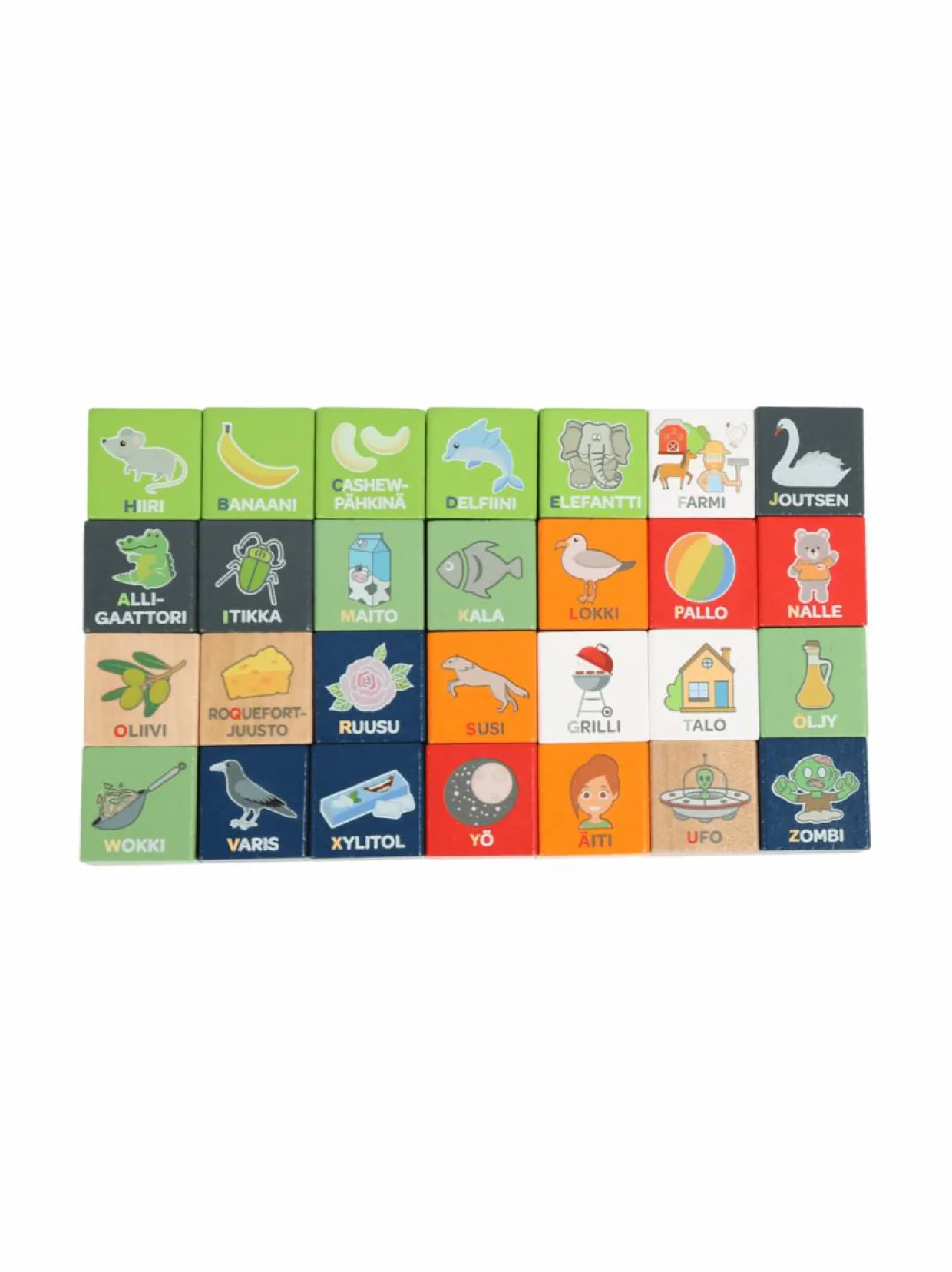 Säilytä yhteystiedot myöhempää tarvetta varten. Tuotteen muotoilu, värit ja tekniset yksityiskohdat saattavat vaihdella.Tuotenumero1544251 Ikäsuositus2+ Avainsanatpuupelipalikat, aakkospelit, opetuslelut, suomalaiset palikat, lasten aakkoslelut, kielelliset pelit, puiset aakkoset