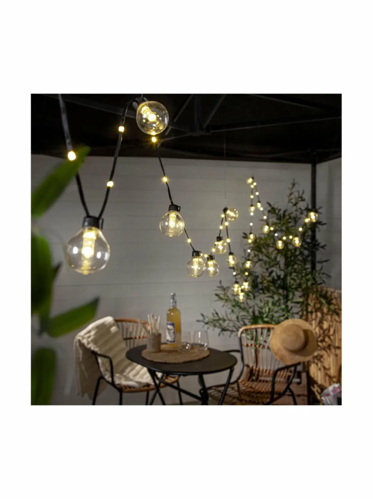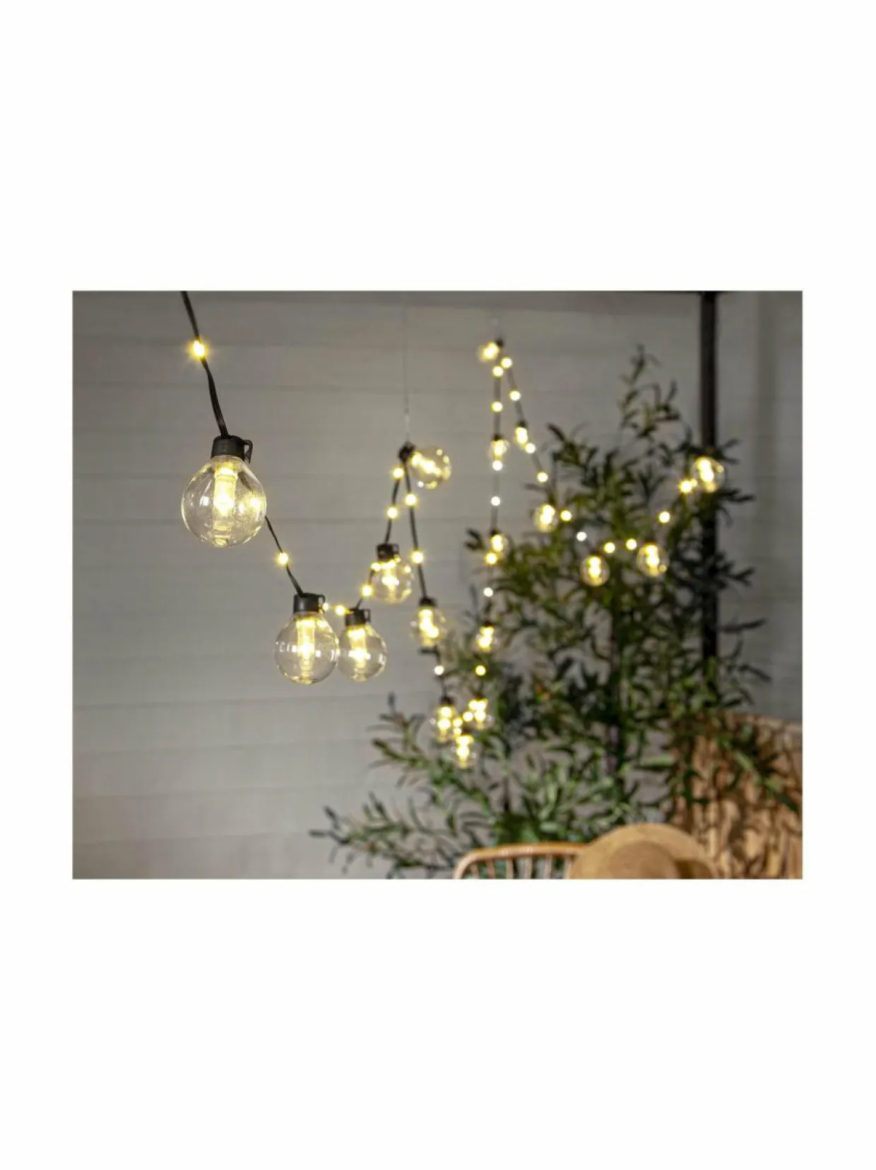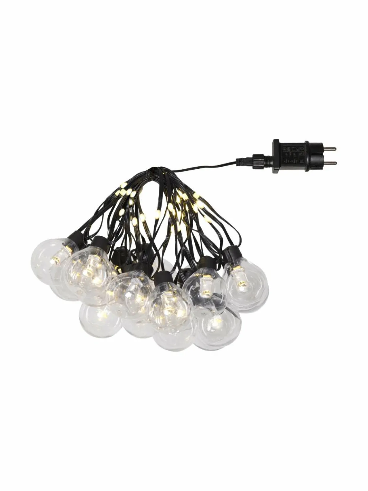 Ulkokäyttöön sopiva Star Trading Bolla -valosarja, jossa on 20 halkaisijaltaan 4 cm olevaa kirkasta pyöreää lamppua, lisäksi jokaisessa lamppuvälissä on kaksi lämpimän valkoista LED-valoa. Valosarja sopii sekä arkeen että juhlaan. Kaapeli on litteä ja ohut, ja lamppujen väli 10 cm. Valosarjassa on 8 eri vilkkumistoimintoa, joista voi valita mieleisensä painamalla muuntajassa olevaa nappia. Johdon pituus 500 cm. Pituus 530 cm. Leveys 5 cm. Korkeus 6 cm. Kiinteä LED, lamppuja ei voi vaihtaa. IP-luokitus IP44. Lamppu: 60 LEDiä yhteensä 2 W.