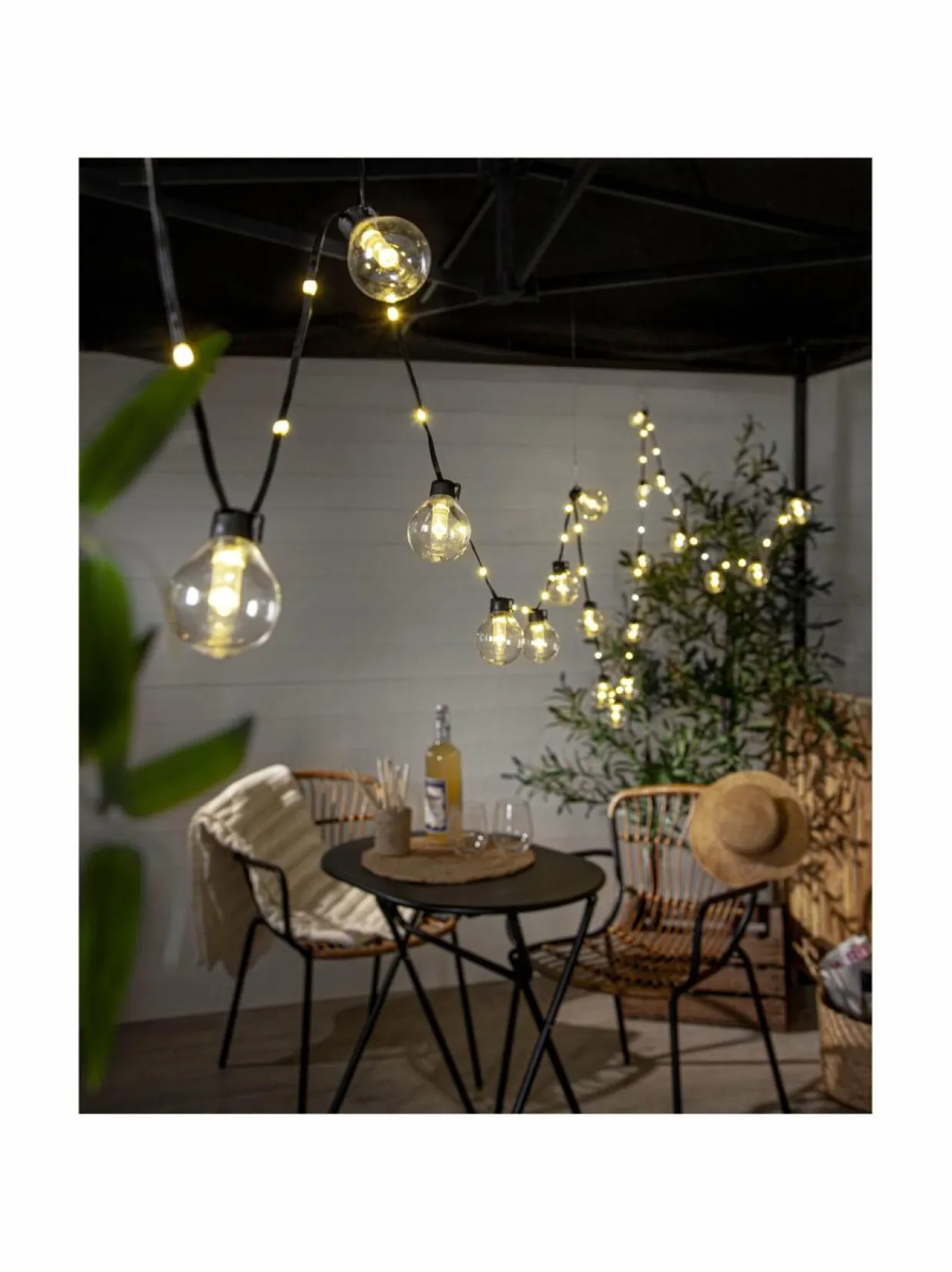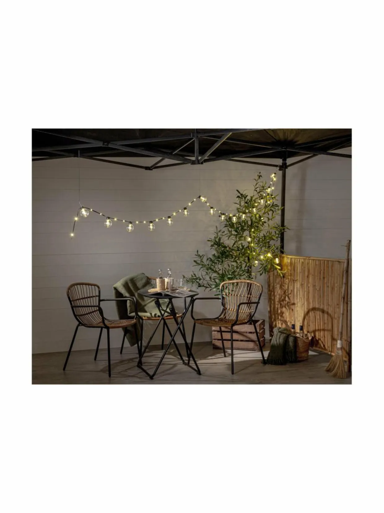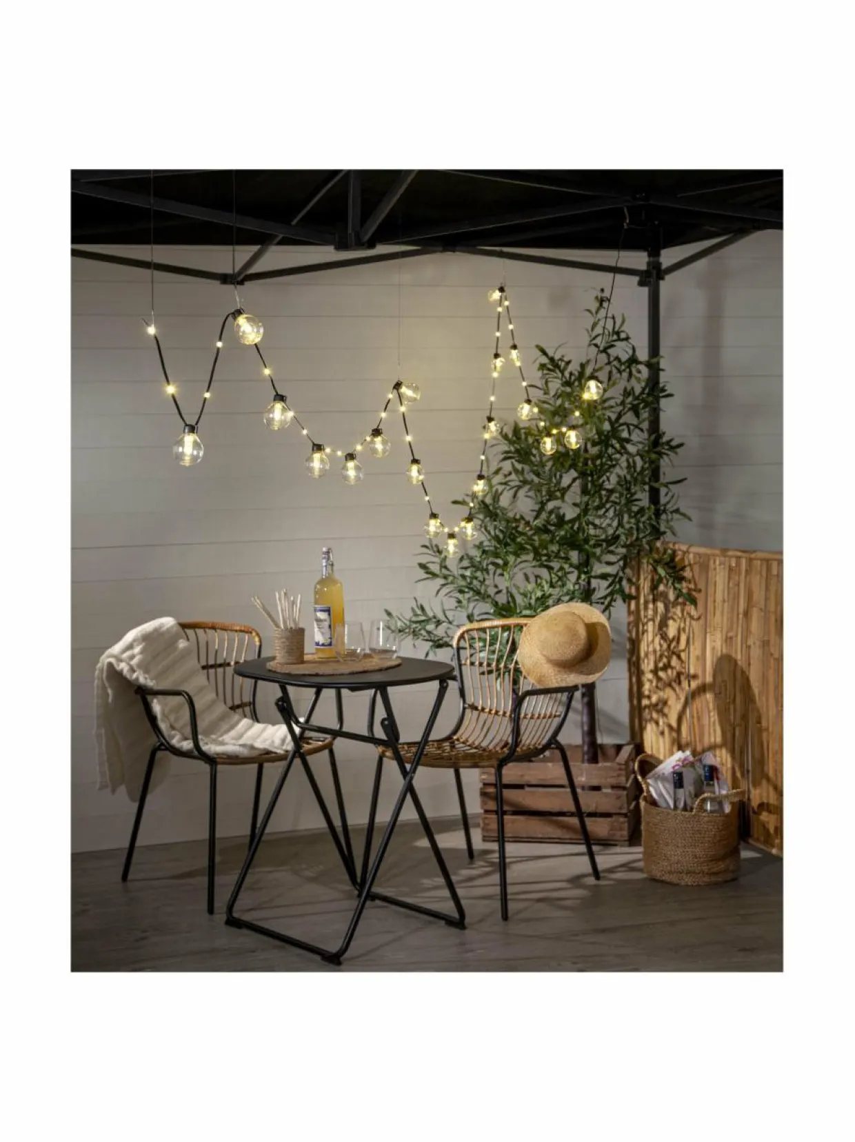 Ulkokäyttöön sopiva Star Trading Bolla -valosarja, jossa on 20 halkaisijaltaan 4 cm olevaa kirkasta pyöreää lamppua, lisäksi jokaisessa lamppuvälissä on kaksi lämpimän valkoista LED-valoa. Valosarja sopii sekä arkeen että juhlaan. Kaapeli on litteä ja ohut, ja lamppujen väli 10 cm. Valosarjassa on 8 eri vilkkumistoimintoa, joista voi valita mieleisensä painamalla muuntajassa olevaa nappia. Johdon pituus 500 cm. Pituus 530 cm. Leveys 5 cm. Korkeus 6 cm. Kiinteä LED, lamppuja ei voi vaihtaa. IP-luokitus IP44. Lamppu: 60 LEDiä yhteensä 2 W.