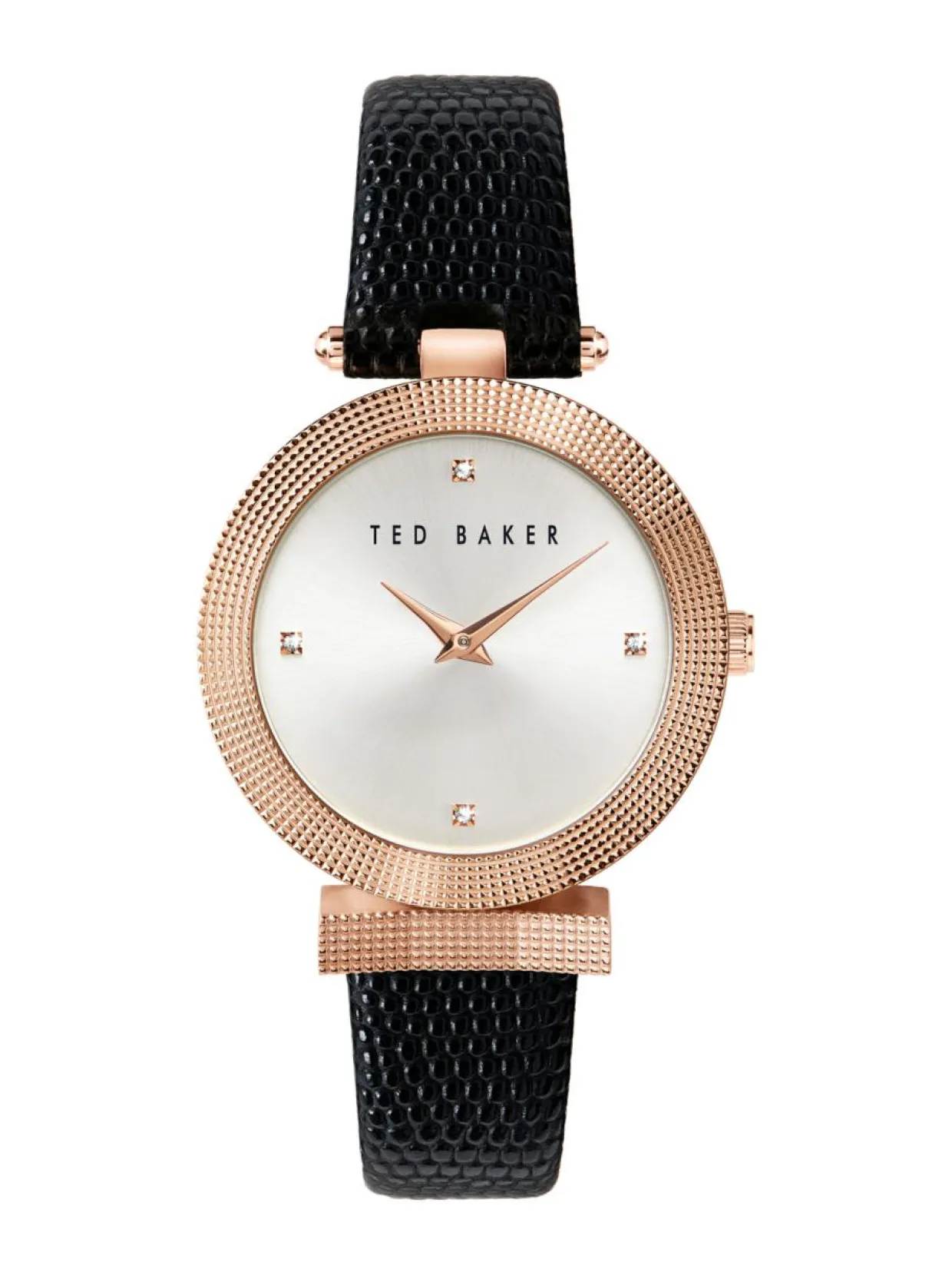 Ted Baker Bow-mallisto on naisellisia yksityiskohtia täynnä. Neljännestuntien kohdalla on swarovski-kristallit ja rungon alaosassa on Tedille tunnusomainen rusettimuotoilu. Liskokuvioinen nahkaranneke täydentää kellon selkeän ilmeen. Kellon ruusukullanvärinen runko on valmistettu ruostumattomasta teräksestä ja sen leveys on 36mm ja paksuus on 8mm. Kellon taulu on hopeanvärinen, kellossa on mineraalilasi ja Y120E-kvartsikoneisto. Kellon vesitiiviys on 5ATM. Ted Baker kelloilla on 2 vuoden takuu.