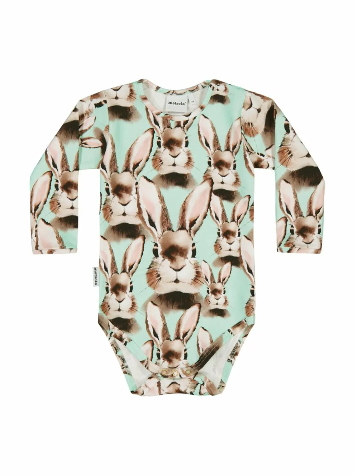 Metsola-merkin Bunny-body on valmistettu pehmeästä ja mukavasta puuvillasekoitteesta. Bodyssa on pitkät hihat ja kaunis pupukuvio. Puuvilla on luonnollinen ja hengittävä materiaali, joka sopii erinomaisesti vauvojen ja lasten herkälle iholle. Elastaanin ansiosta body on joustava ja sopii täydellisesti lapsen liikkeisiin.