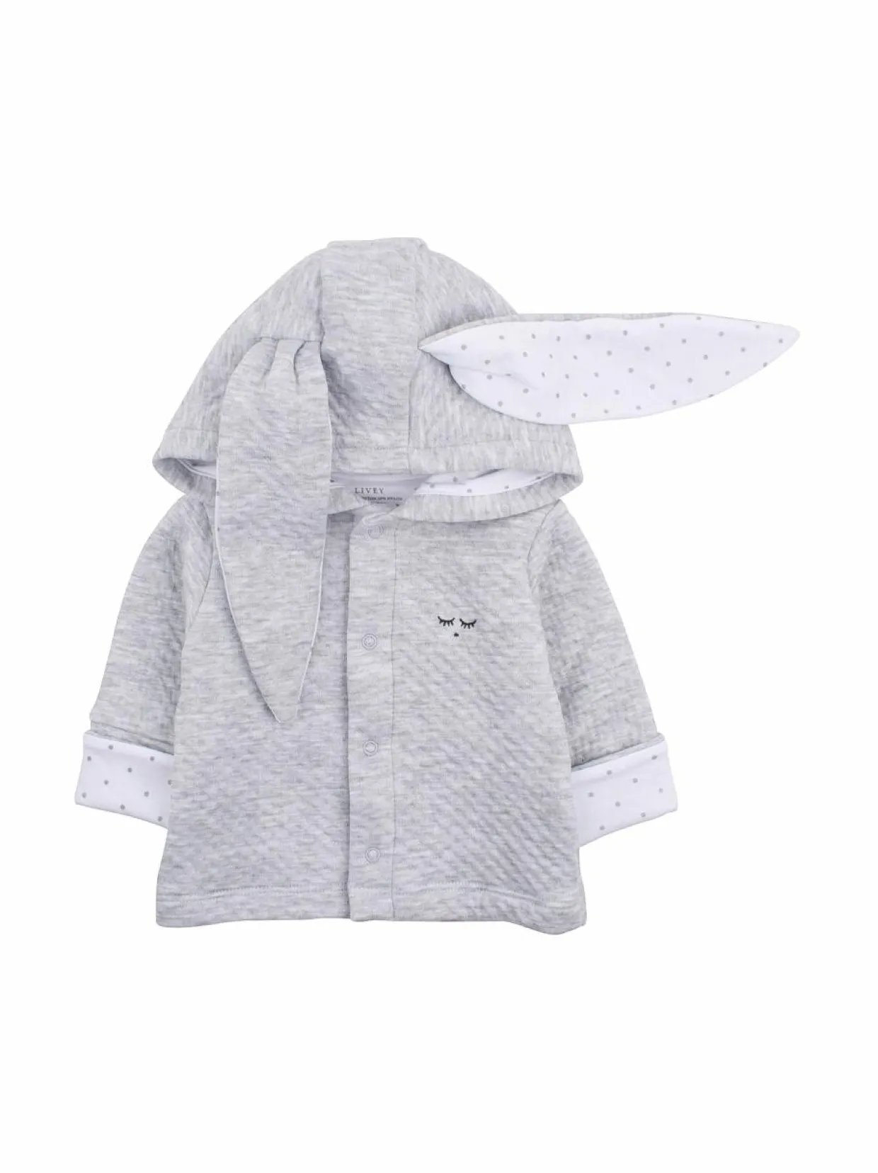 Suloinen vauvojen takki, jossa hauskat pupunkorvat. Kiinnitys neppareilla. Takki on valmistettu Pima-puuvillan ja polyamidin sekoitteesta.