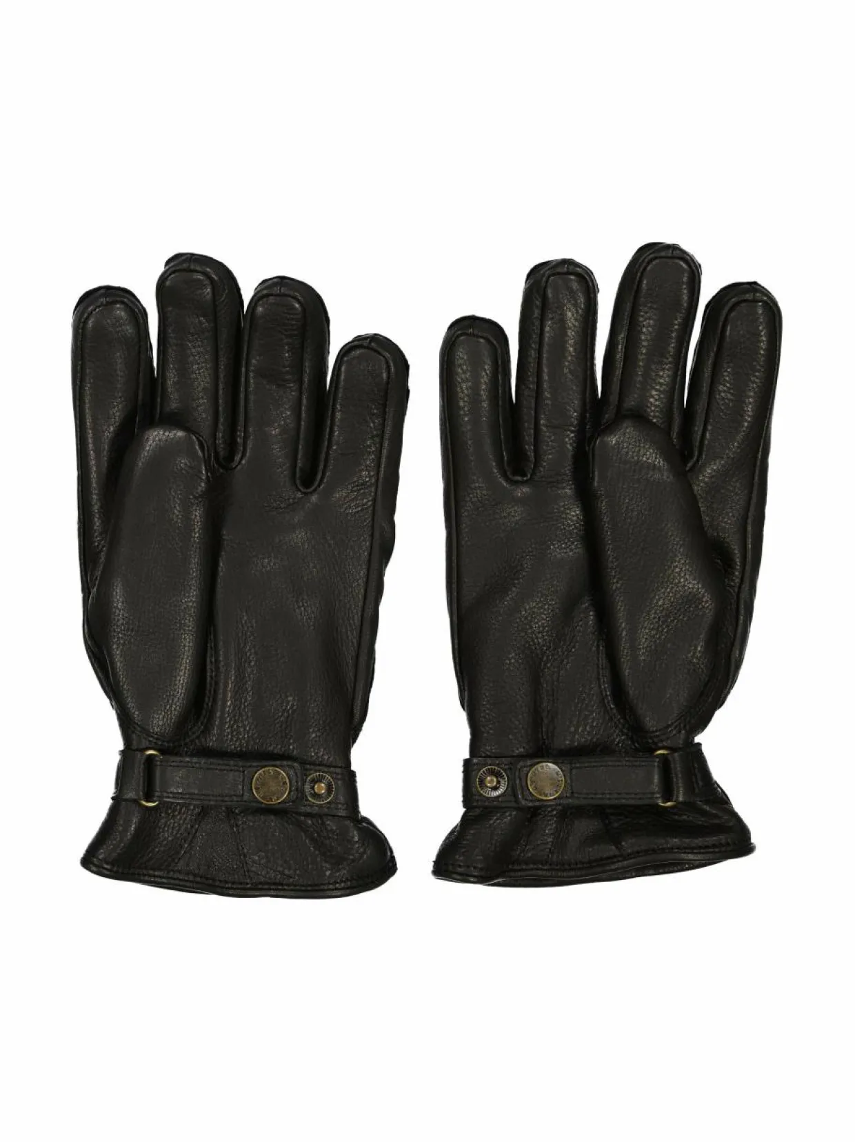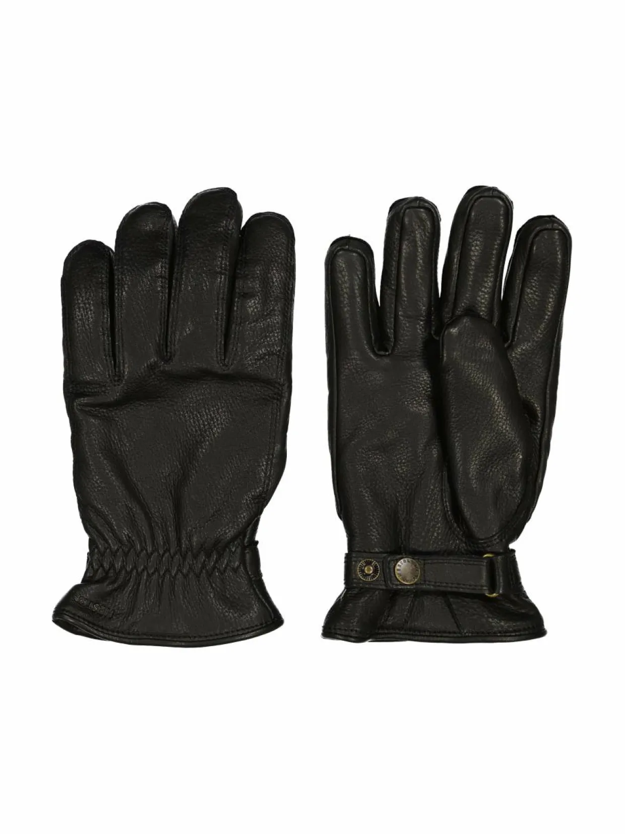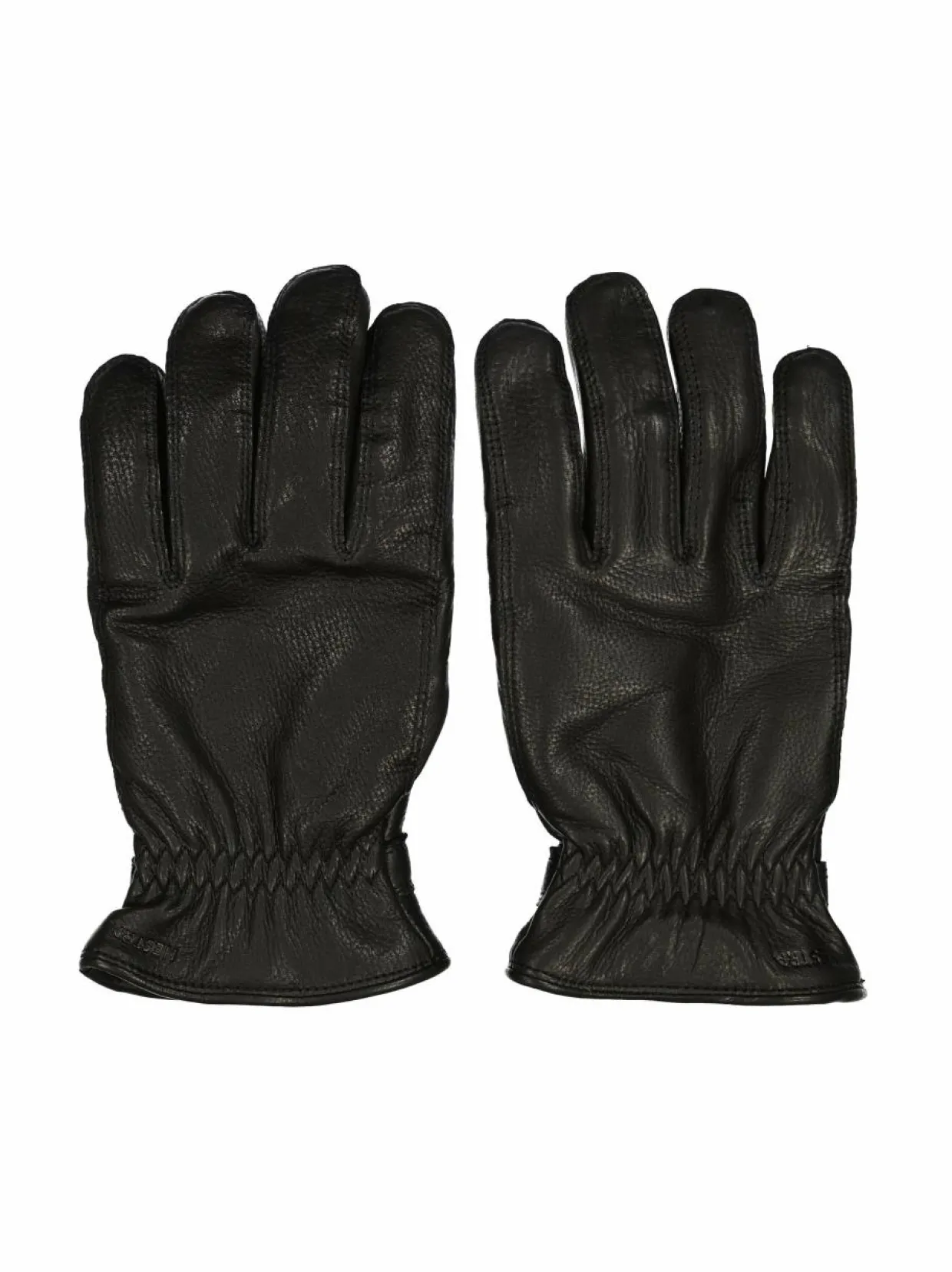 Hestran Burensvik-käsineet on valmistettu nahasta ja niissä on lämmin villavuori. Ranteiden istuvuutta voi säädellä nepparillisilla remmeillä. Reunalla on somisteena logoteksti.