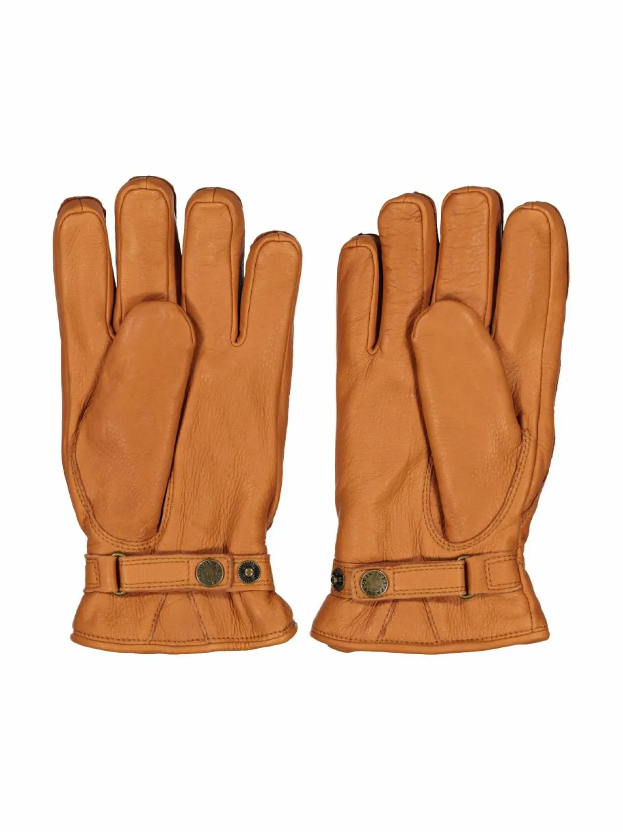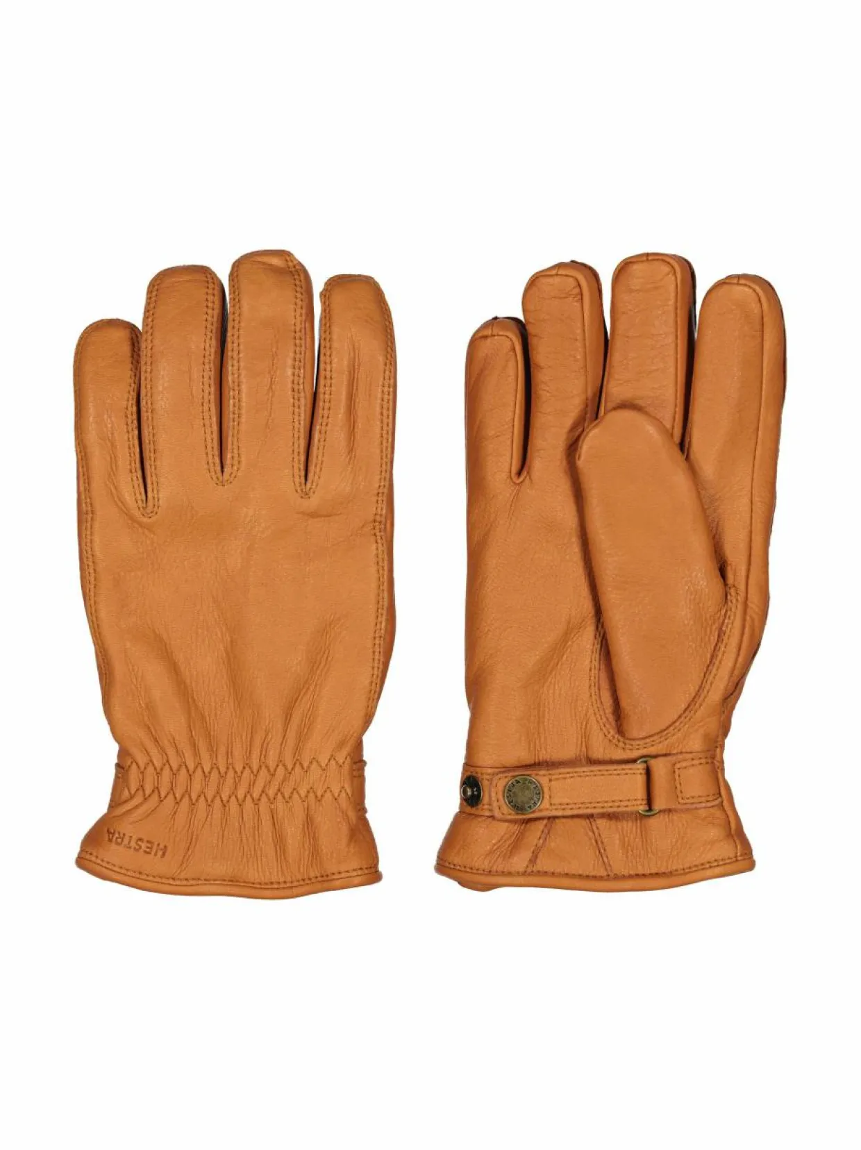 Hestran Burensvik-käsineet on valmistettu nahasta ja niissä on lämmin villavuori. Ranteiden istuvuutta voi säädellä nepparillisilla remmeillä. Reunalla on somisteena logoteksti.