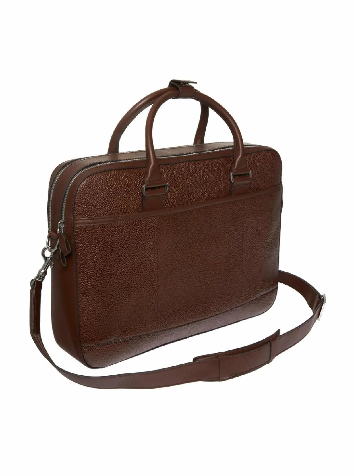 Hienorakenteisesta lehmännahasta valmistettu salkku Tiger of Sweden merkiltä. Laukussa on kaksi mukavaa kantokahvaa ja irrotettava olkahihna. Se suljetaan kahdella vetoketjulla. Sisältä löydät lisätaskun. Mitat: Pituus 40 cm, korkeus 29 cm ja syvyys 7,5 cm.