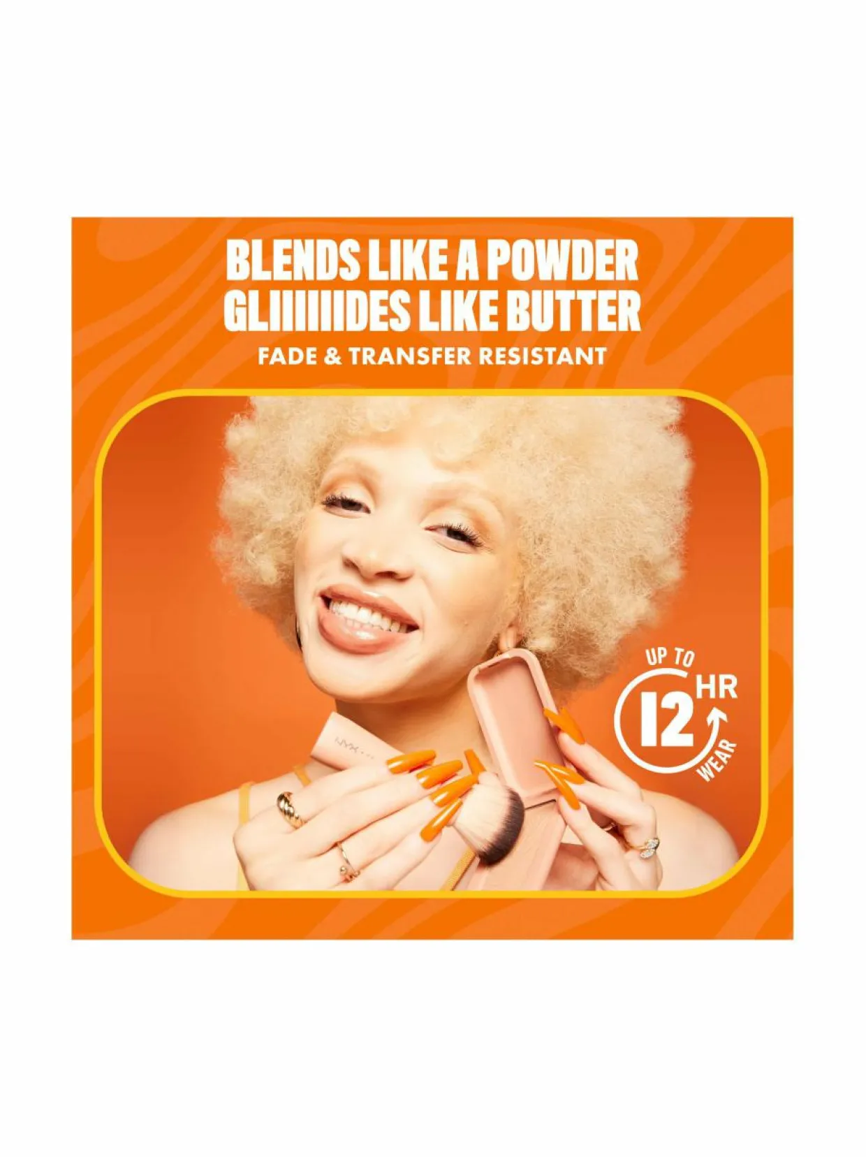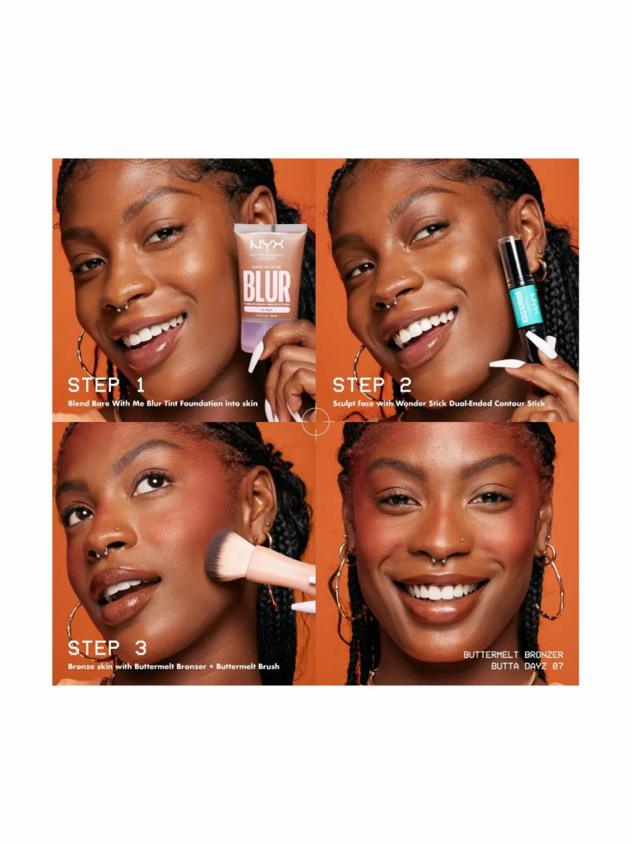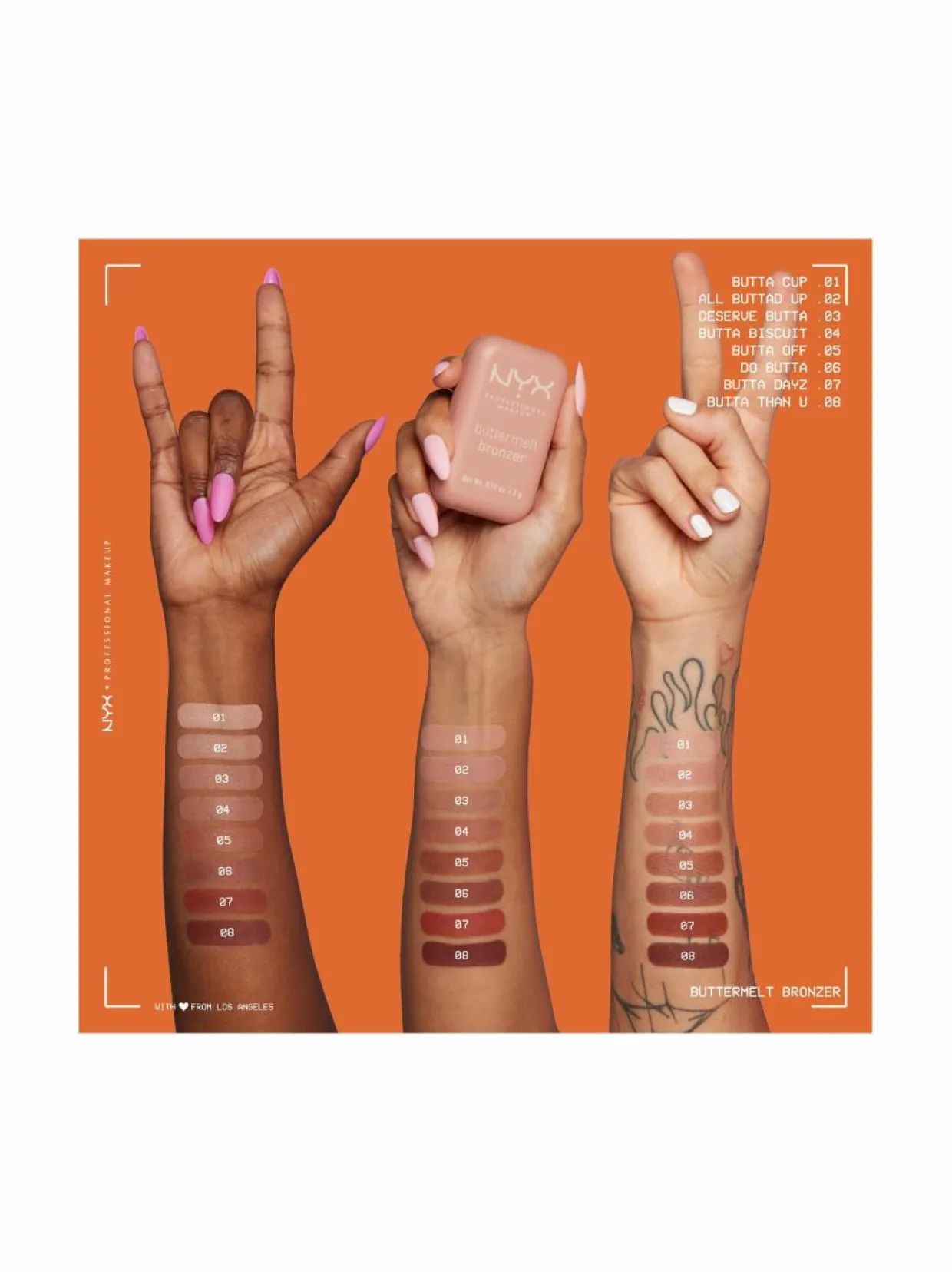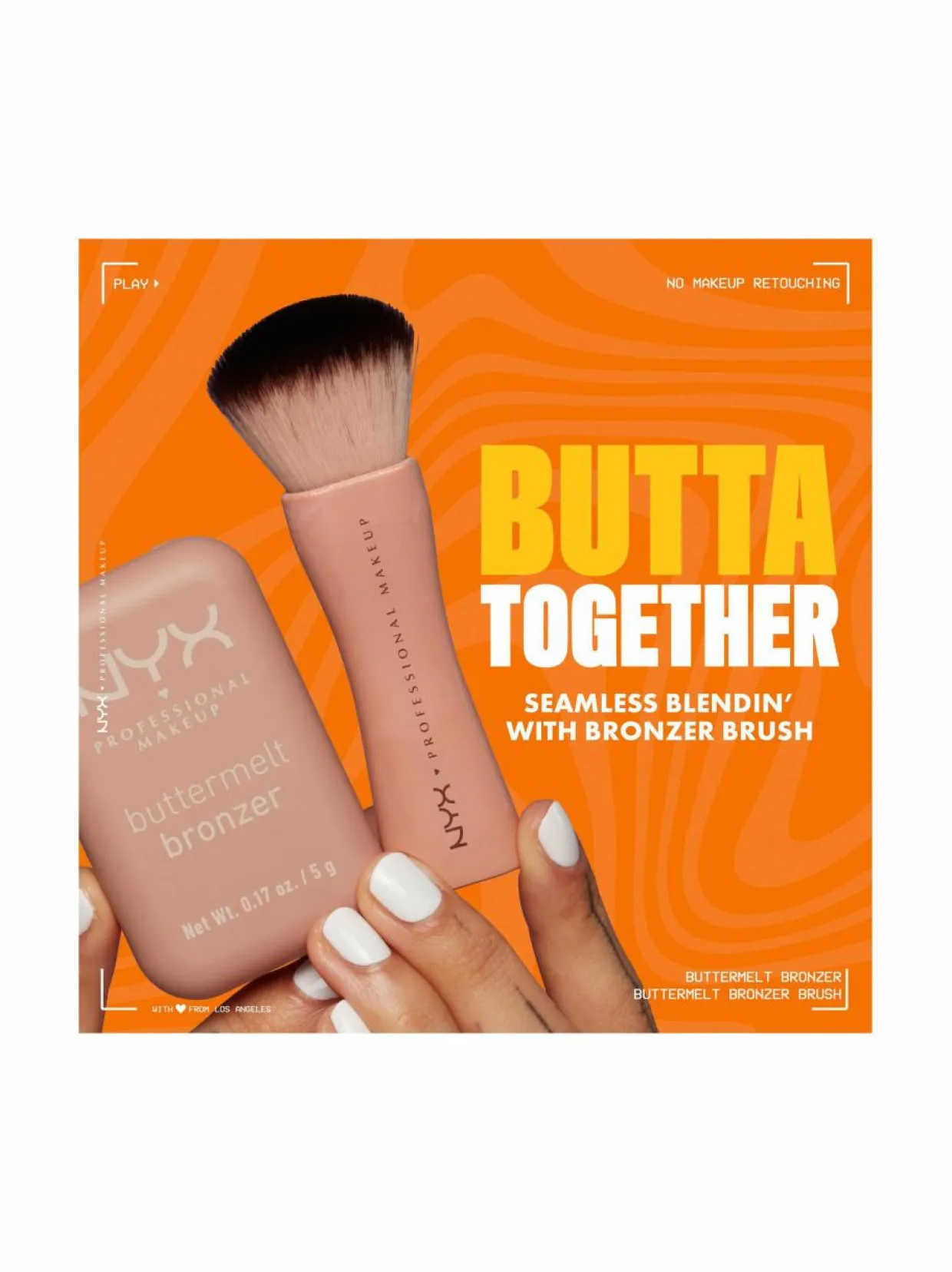 NYX Professional Makeup Buttermelt Bronzer -aurinkopuuteri antaa iholle päivettyneen lookin koko päiväksi. Puuterimainen koostumus levittyy iholle pehmeästi ja antaa kauniin, silkinpehmeän lopputuloksen sekä upeaa hehkua. Koostumus sisältää mango-, karite-, ja mantelivoita. Levitä Buttermelt Bronzer Brush -meikkisiveltimellä.
