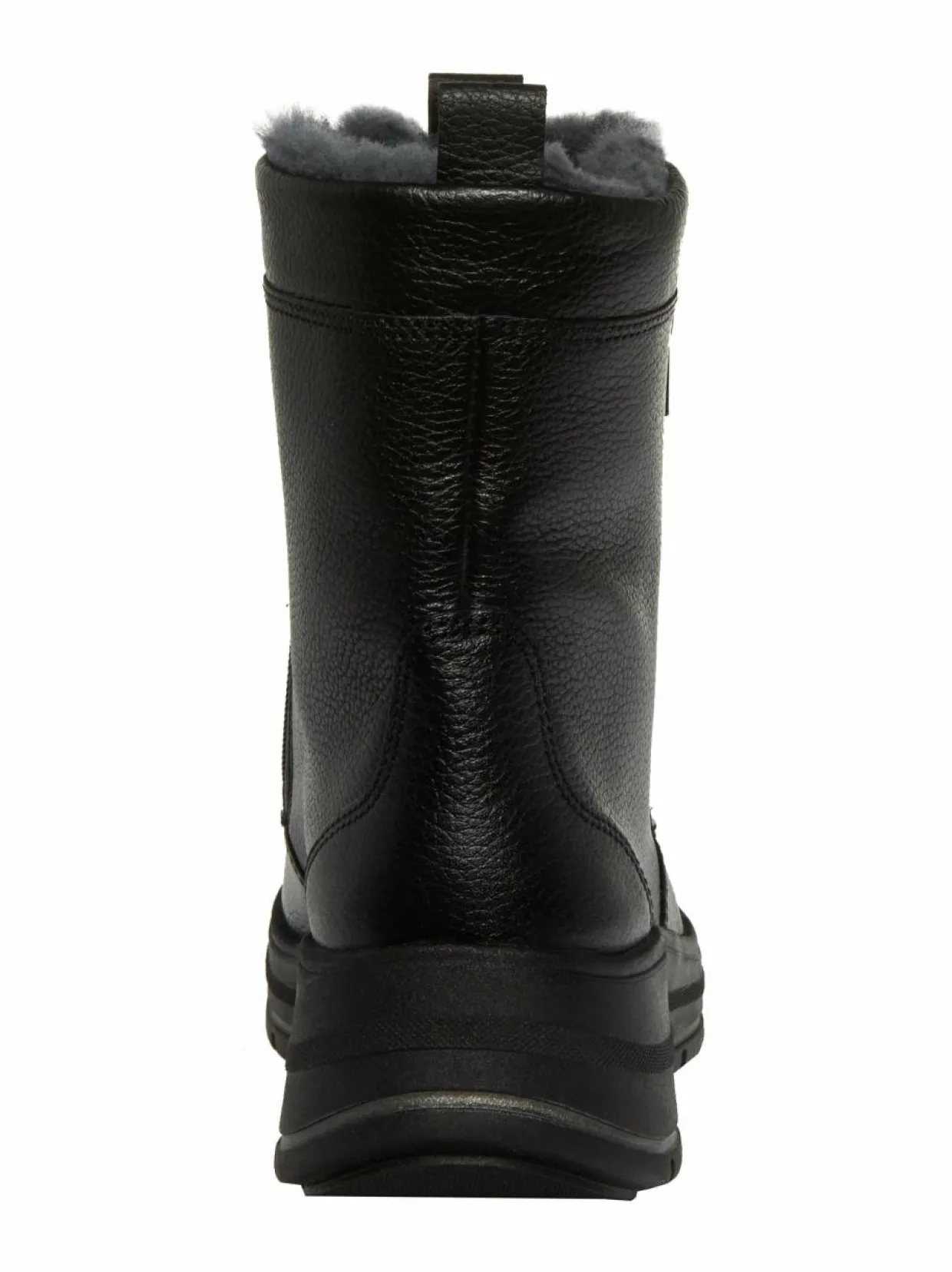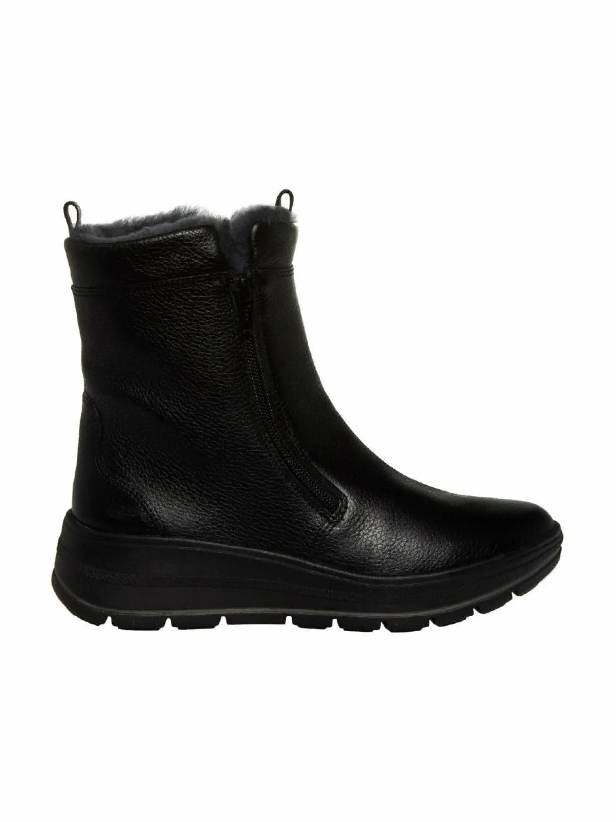 Aran Calais H-last Two Zippers -nilkkureissa on rakeinen nahkapinta. Sisäpuoli on vuorattu lämpimällä, jalkoja hellivällä lampaanturkiksella. Kengät ovat vaivattomat pukea ja riisua päällisen kahden vetoketjun ansiosta.