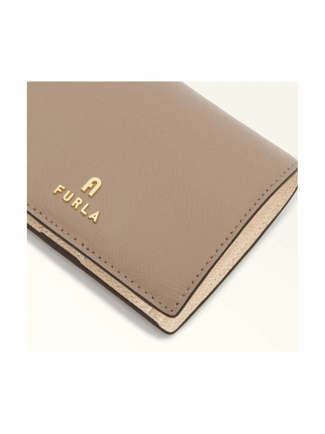 Furlan taitettava Camelia S Compact -lompakko on valmistettu ylellisestä nahasta, jota koristaa metallinen logo. Lompakossa on korttipaikkoja, setelitasku, kuittitaskuja sekä nepparikiinnitteinen kolikkotasku. Lompakko suljetaan nepparilla.