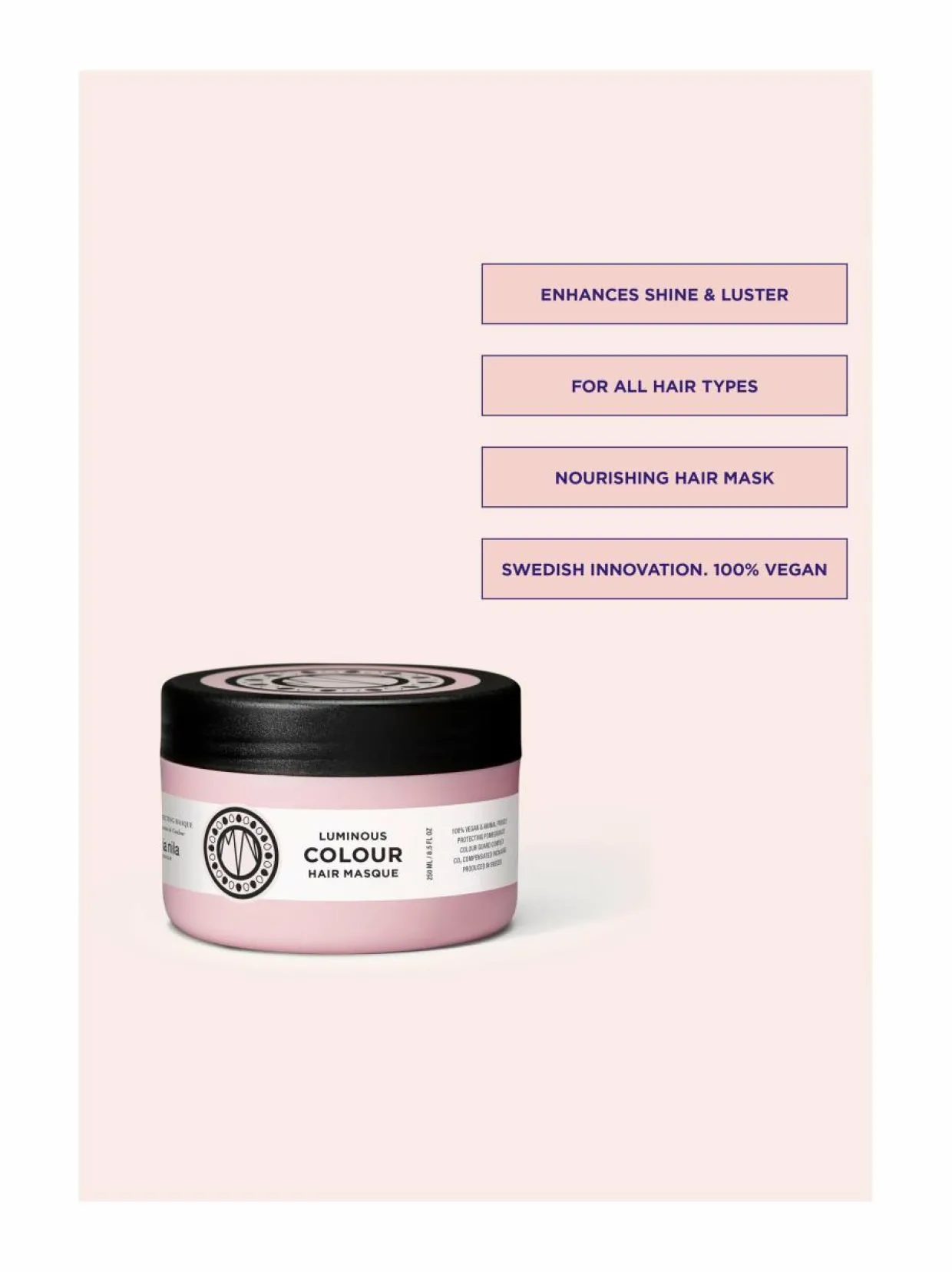 Hellävarainen Maria Nila Care & Style Luminous Colour Masque -hiusnaamio sopii värjätyille hiuksille. Palauttaa kosteuden, ravitsee ja tekee hiukset silkinpehmeiksi. Granaattiomenauute ja Colour Guard Complex vähentävät värin kulumista pesun ja lämpömuotoilun yhteydessä sekä suojaavat hiuksia myös UV-säteilyltä ja vapailta radikaaleilta.