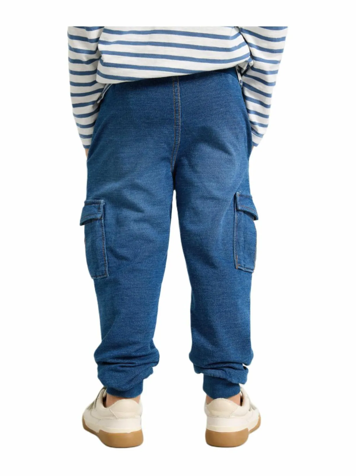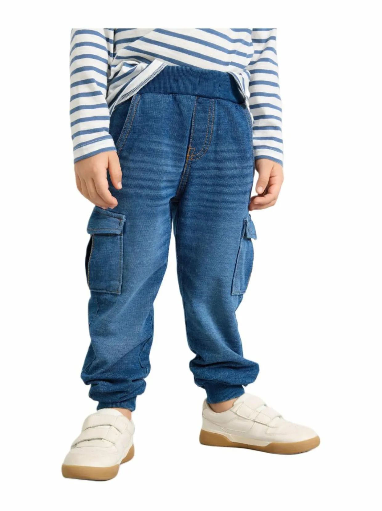 Lindexin pehmeät ja mukavat cargo-housut, jotka on valmistettu puuvillatrikoosta. Housuissa on denim-tyyli ja reisitaskut sivuilla. Cargo-housuissa on joustava, säädettävä vyötärönauha ja ribatut lahkeensuut.