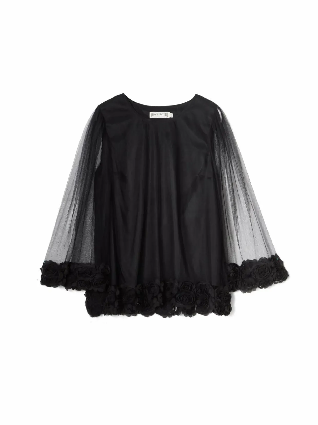 Ida Sjöstedtin kauniisti laskeutuva pusero on suunniteltu hieman väljemmällä suoralinjaisella istuvuudella. Yksityiskohtana läpikuultavat pitkät hihat ja 3D-ruusureunus hihansuissa sekä helmassa.