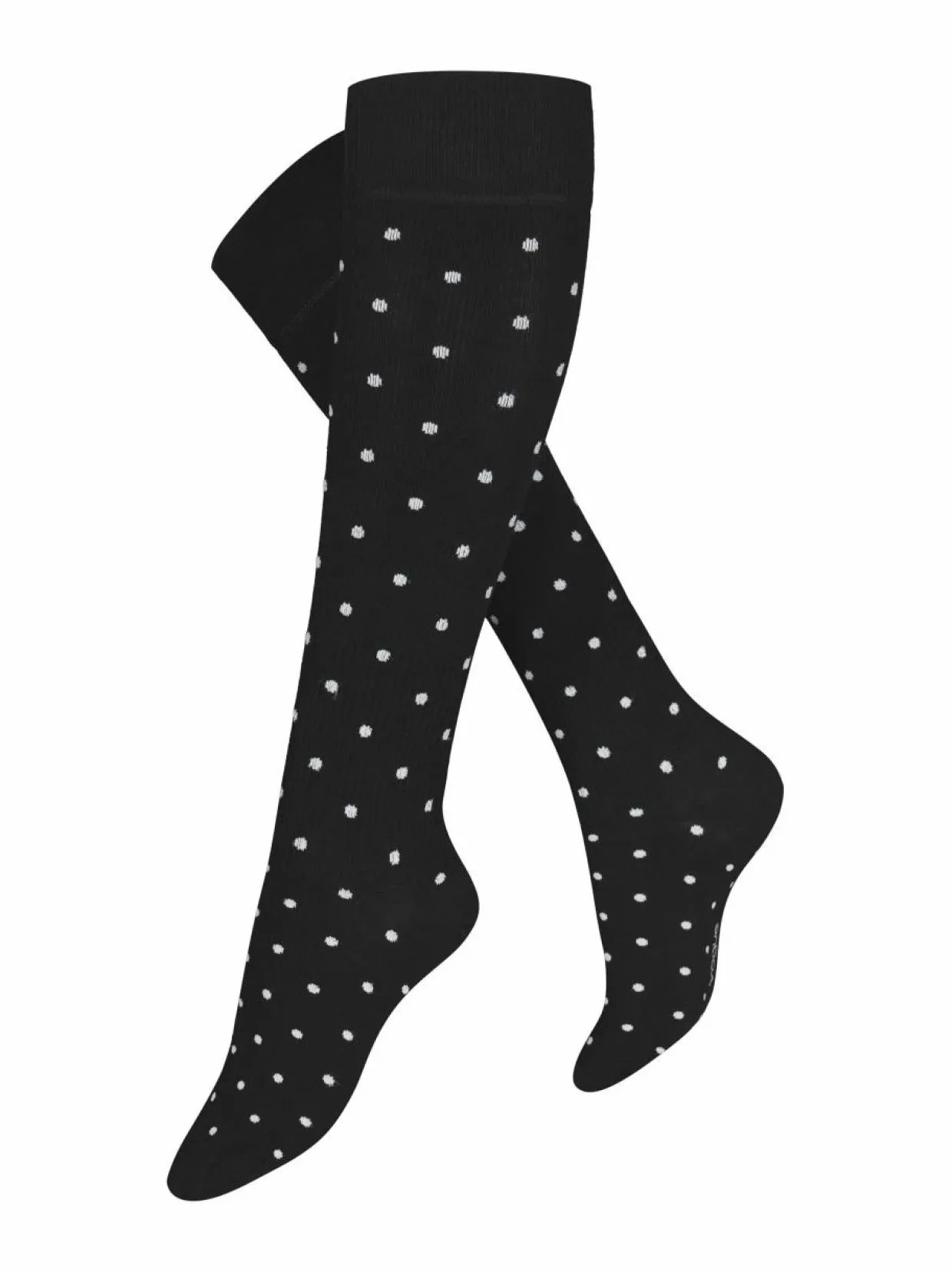 Pehmeästä sekä joustavasta luomupuuvillasekoitteesta valmistetut pilkkukuosiset polvisukat Vogue merkiltä. Asteittainen kompressio auttaa jalkojasi pysymään kevyinä koko päivän ajan.