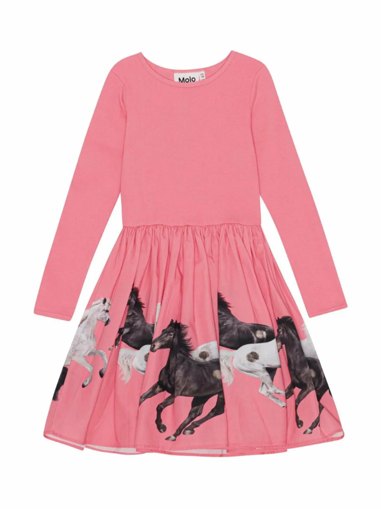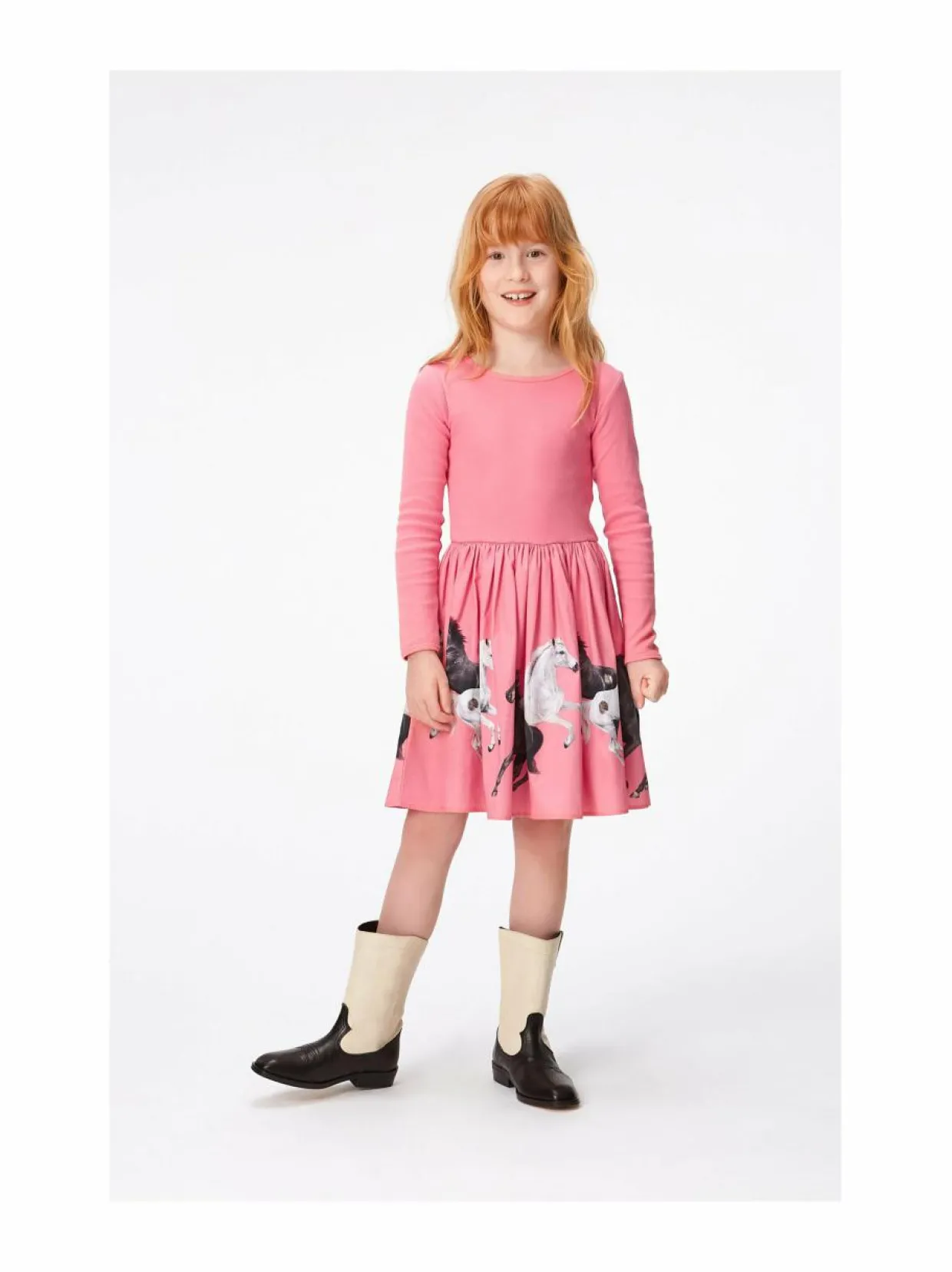 Mukava luomupuuvillainen trikoomekko hienolla hevosprintillä. Mekon yläosa on joustavaa ribbineulosta ja helma laadukasta puuvillapopliinia.