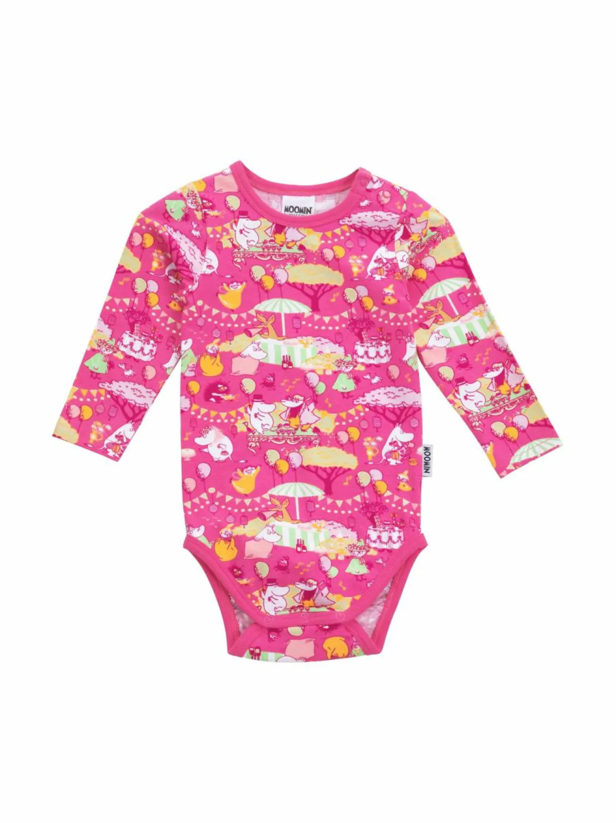Muumien pehmeä ja mukava Celebrate-body vauvoille. Mallissa on pitkät hihat sekä nepparit olkapäillä ja haarassa. Lisäksi siinä on ylimääräistä tilaa vaipalle. Bodyssa on hauska kuvio täynnä muumihahmoja. Joustava ja miellyttävä materiaali on 95 % puuvillaa ja 5 % elastaania.