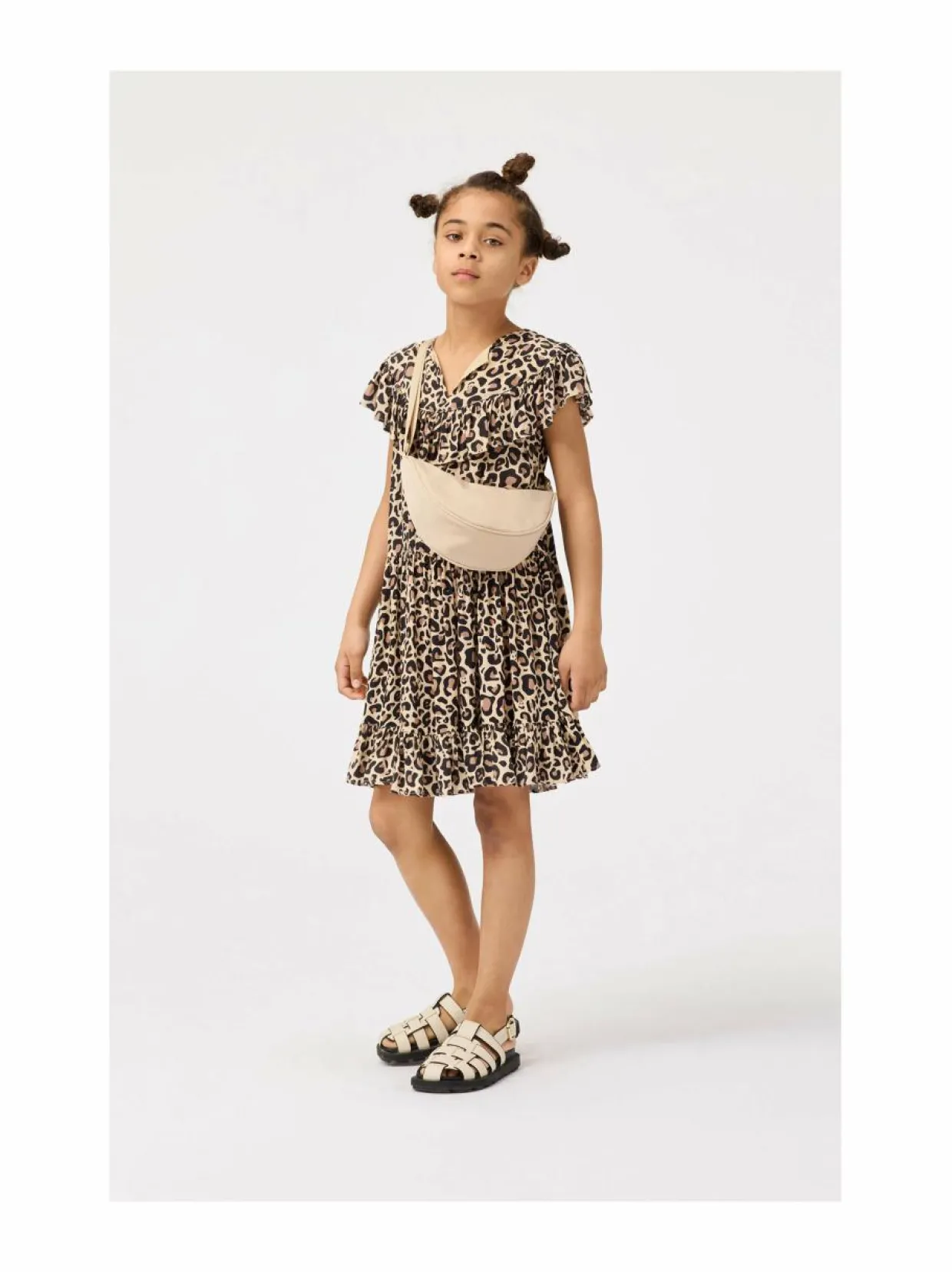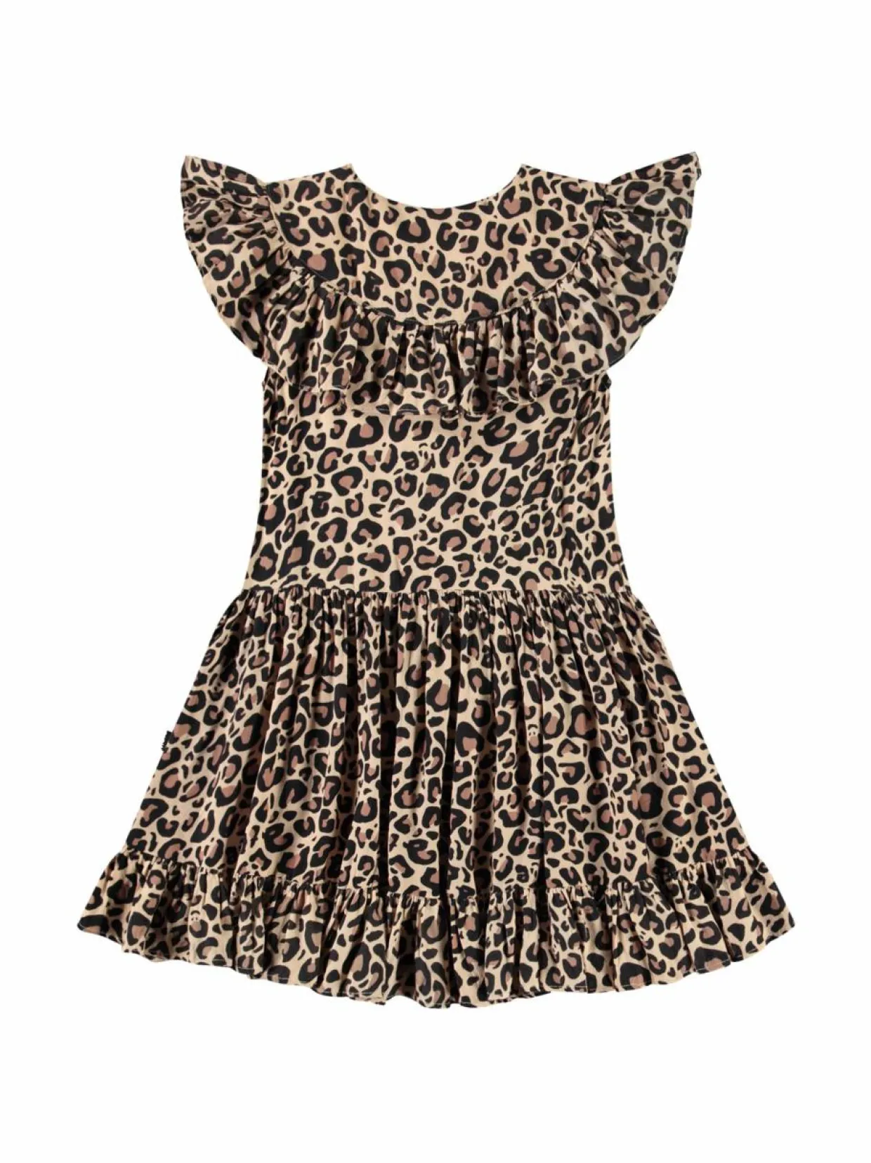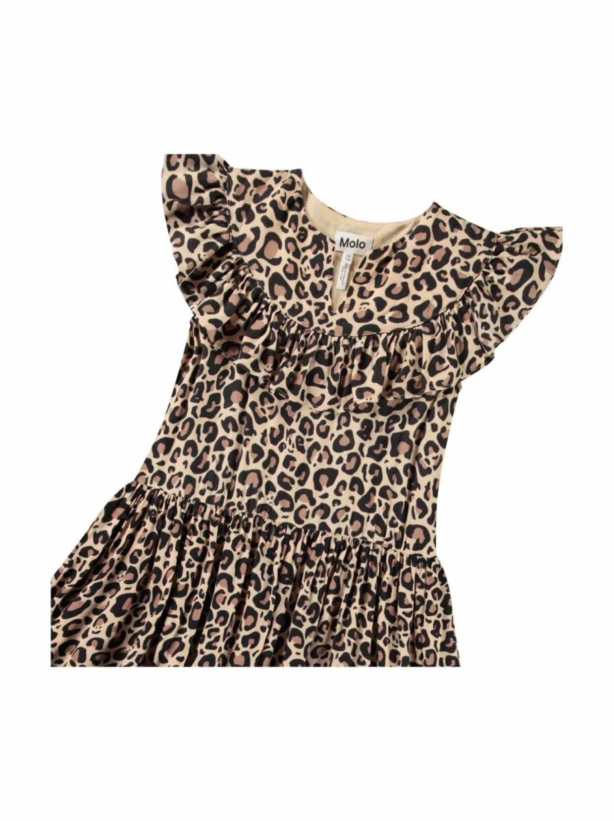 Molon Cho-mekko on valmistettu pehmeästä viskoosista ja siinä on kaunis leopardikuosi. Mekossa on rypytetty ja kellotettu helma. Yksityiskohtana näyttävä frillareunus.