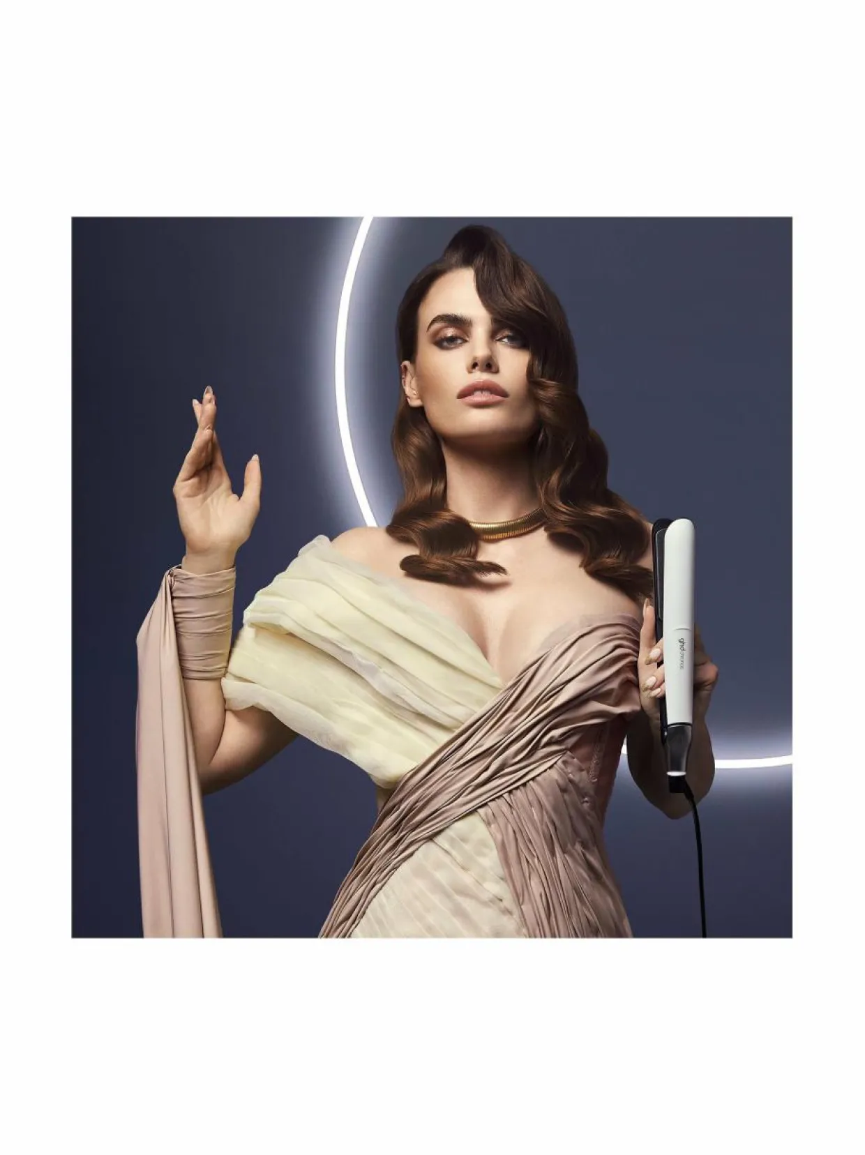 - Aloita kuivaamalla hiukset ghd helios -hiustenkuivaajalla. Mukana tulevalla suuttimella saat tarkkuutta föönaukseen. Jatka tämän jälkeen muotoiluraudalla.