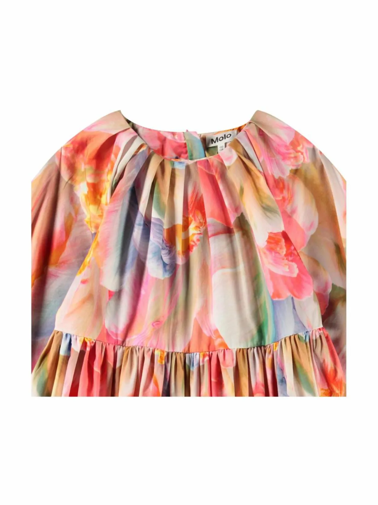 Molon Ciera-mekko on valmistettu pehmeästä luomupuuvillasta ja siinä on hieno tulppaanikuosi. Kukkamekossa on pyöreä pääntie ja 3/4-pituiset hihat. Se on rento ja mukava käyttää. Selässä on vetoketju. Tässä mekkomallissa on kauniit rypytykset miehustassa ja helmassa.