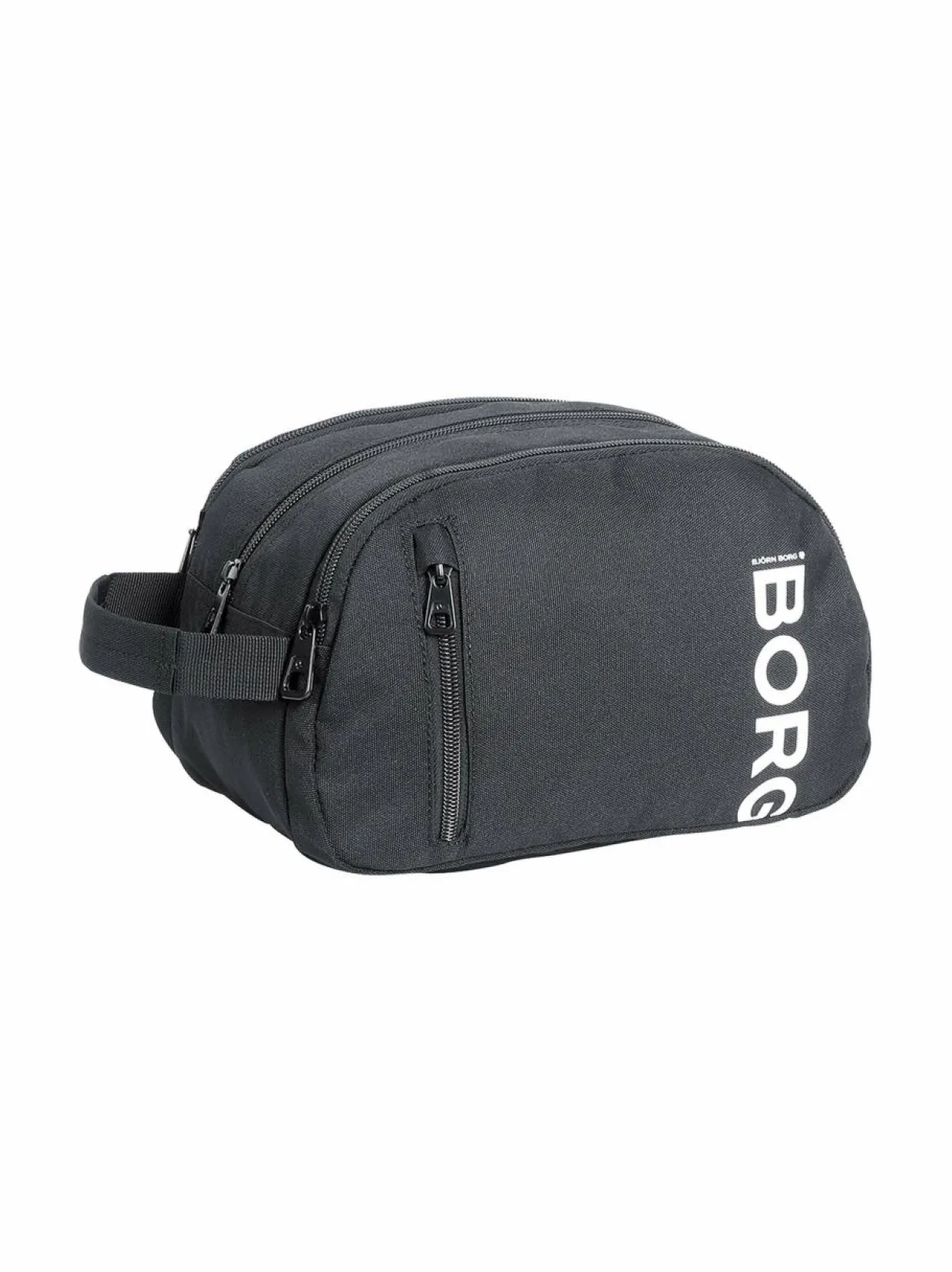 Core Standing -toilettilaukku merkiltä Björn Borg, jossa on kolme säilytysosiota ja pieni vetoketjutasku laukun edessä. Sisällä useita taskuja.