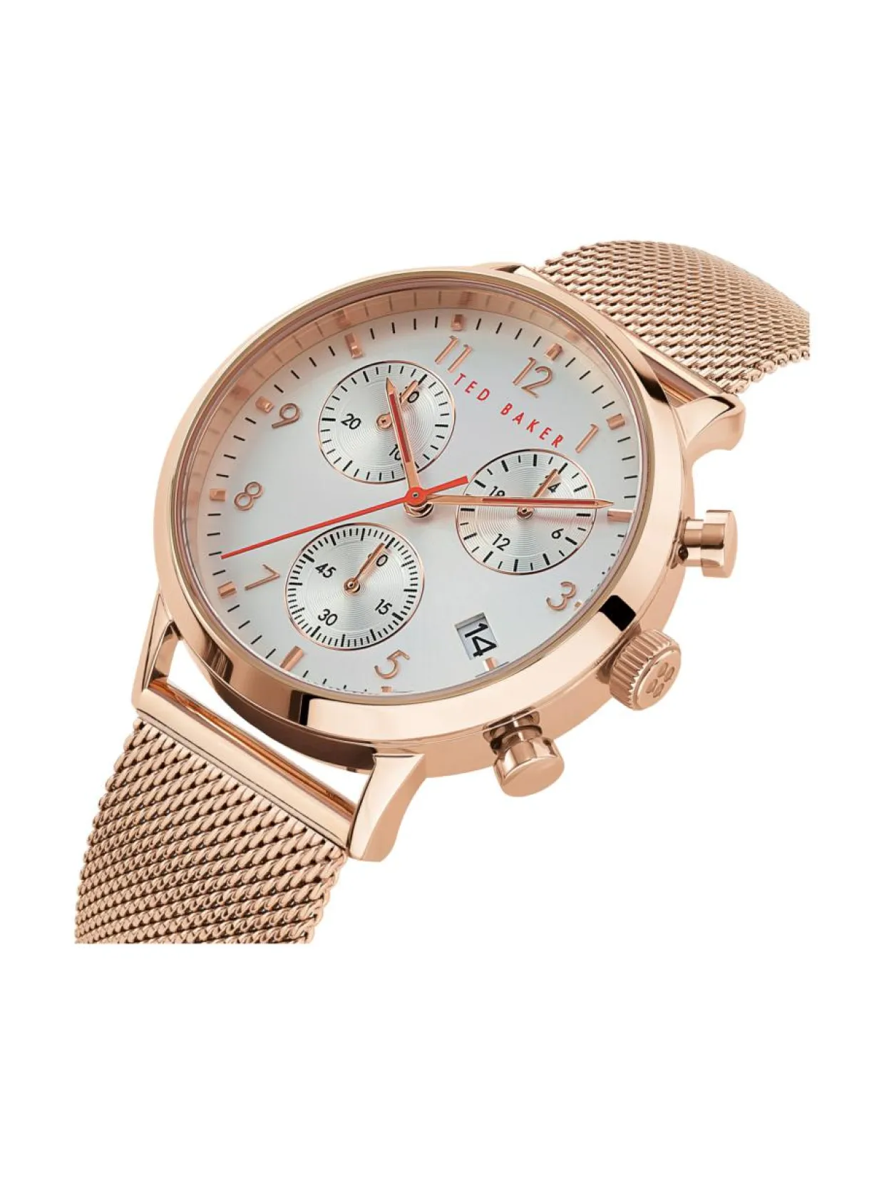 Ted Baker Cosmop Chrono rannekello ei jää huomaamatta. Kellon ruusukullanvärinen runko on valmistettu ruostumattomasta teräksestä. Sen leveys on 40mm ja paksuus 11,5mm. Rannekkeena tässä mallissa on ruusukullanvärinen meshranneke, joka on ruostumatonta terästä. Valkoinen taulun väri antaa kellolle raikkaan ilmeen. Kellossa on mineraalilasi ja kvartsikoneisto. Kellon vesitiiviys on 5ATM. Ted Baker kelloilla on 2 vuoden takuu.