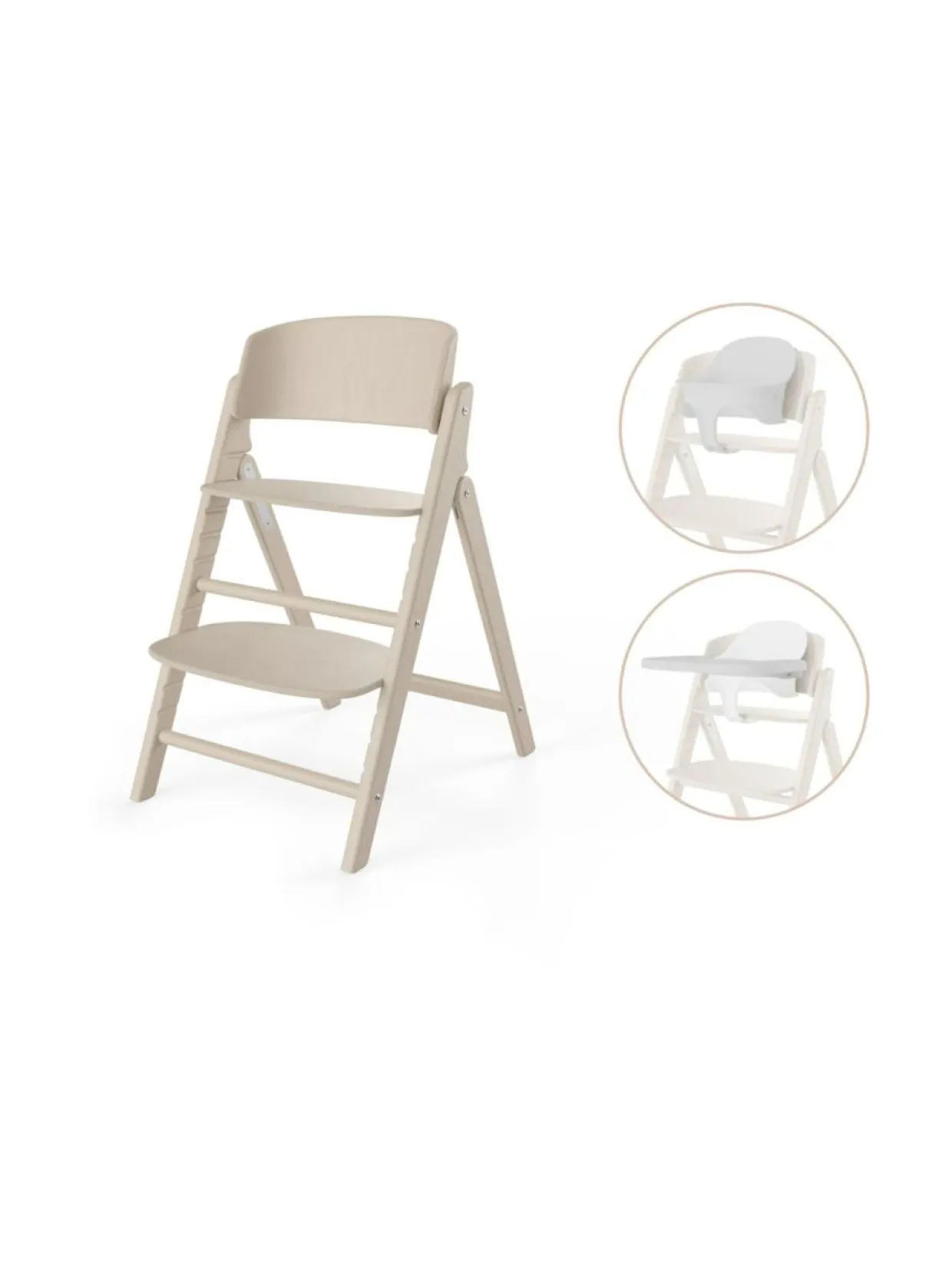 Cybex Click&Fold 3in1 syöttötuolipaketti sopii käyttöön lapselle noin 6kk iästä alkaen. Paketti sisältää puisen Click&Fold tuolin, Baby Set etukaaren 6kk+ ja tarjottimen. Click&Fold on tyylikäs ja pitkäikäinen lasten tuoli, joka on suunniteltu sopimaan käyttöön jo vastasyntyneestä alkaen lisäosien avulla. Lisäksi tuoli voidaan koota nopeasti kahden napin painalluksella, mikä säästää tilaa ja helpottaa tuolin säilyttämistä kotona.