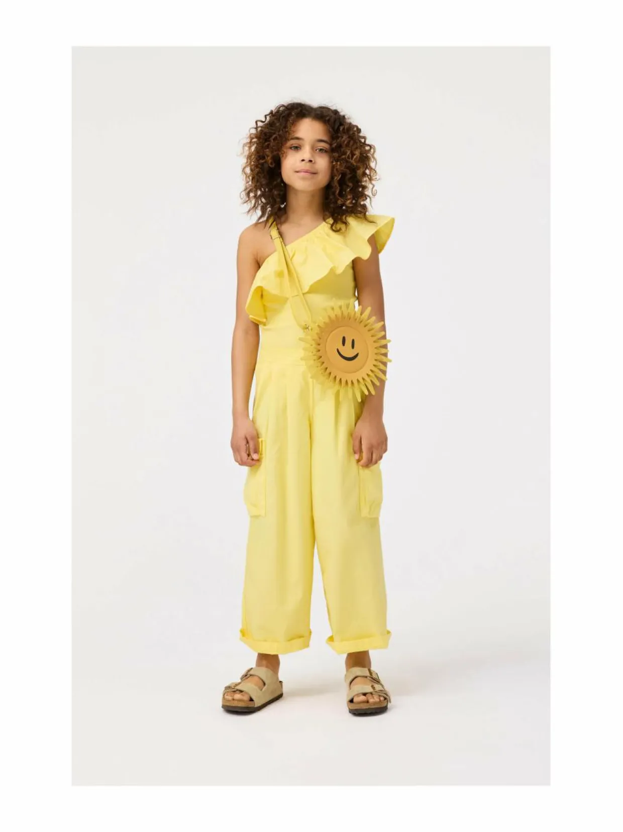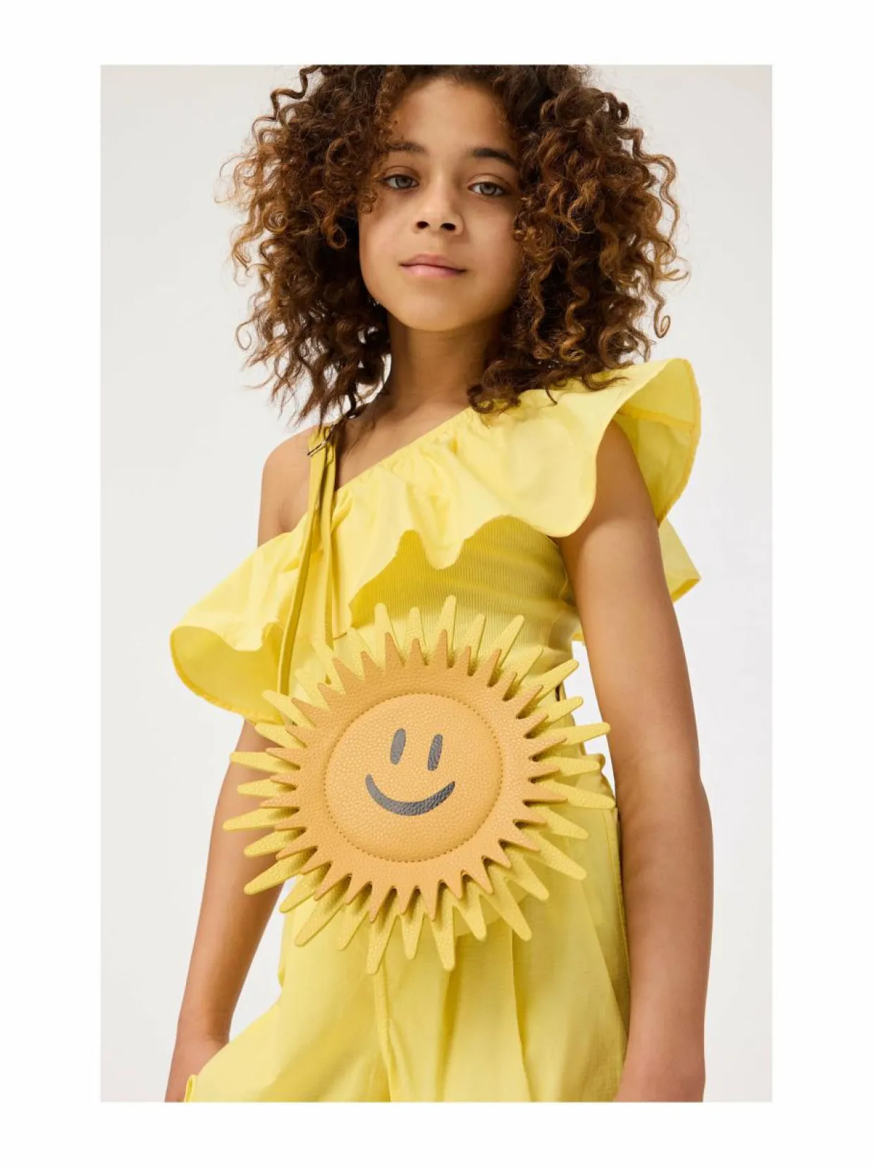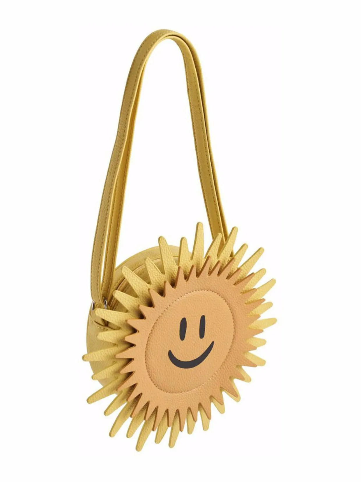 Ihana aurinkon muotoinen olkalaukku kestävää tekonahkaa. Laukun päälokero avautuu vetoketjulla ja siinä on kapea olkahihna, jonka pituutta voi säätää.
