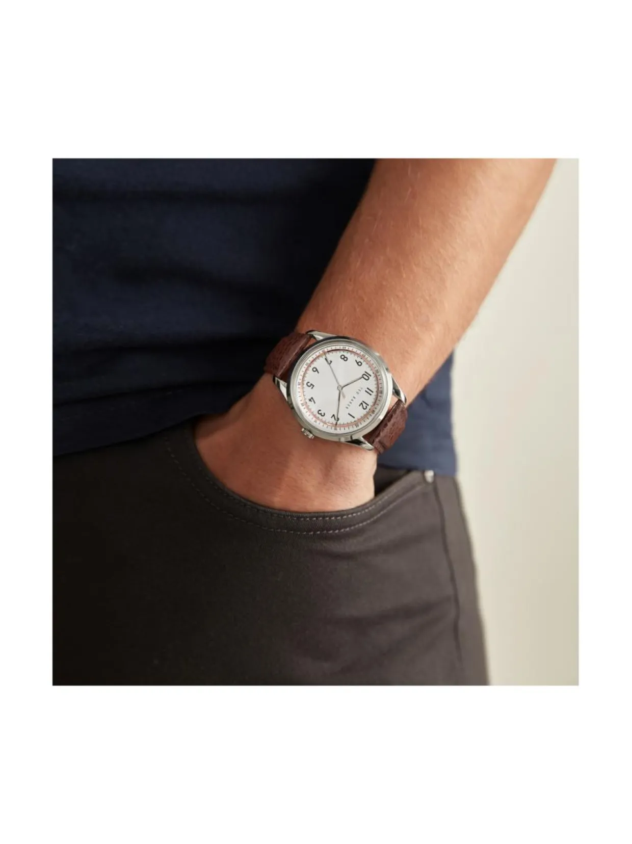 Ted Baker Daquir 40mm rannekello on varma valinta kun haluat, että myös kellon design kestää aikaa. Kellon hopeanvärinen runko on valmistettu ruostumattomasta teräksestä. Sen leveys on 40 mm ja paksuus on 11 mm. Rannekkeena tässä mallissa on ruskea nahkaranneke. Hopeanvärisen kellotaulun ympärillä on ruusukullanvärinen reunus. Kellossa on mineraalilasi ja kvartsikoneisto. Kellon vesitiiviys on 5ATM. Ted Baker kelloilla on 2 vuoden takuu.