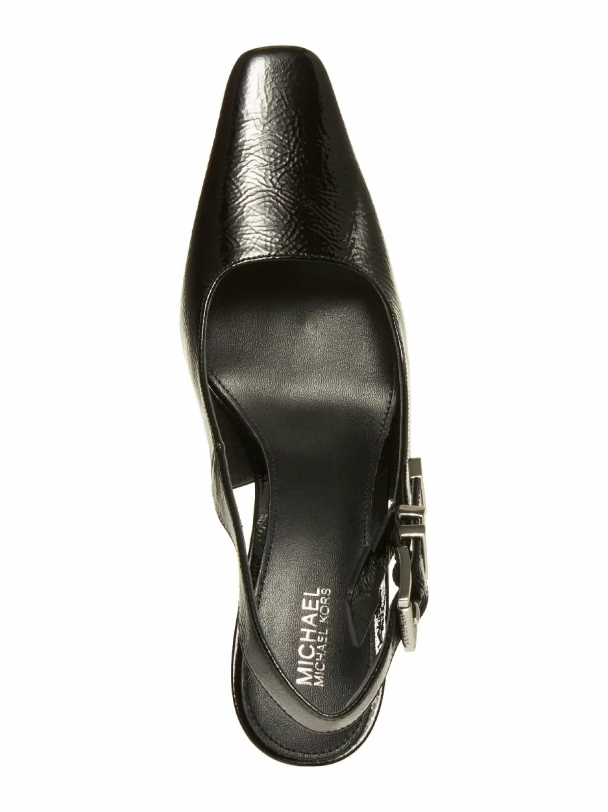Michael Korsin Darrington Sling -nahka-avokkaat leikittelevät kulmikkailla muodoilla. Kengissä on kiiltävä nahkapäällinen ja mattanahkainen sisäpuoli. Kärjet ovat pitkät ja kulmikkaat, luoden dramaattisen ilmeen. Kiinnitetään metallisoljilla. Metalliosia koristavat brändin logotekstikaiverrukset.