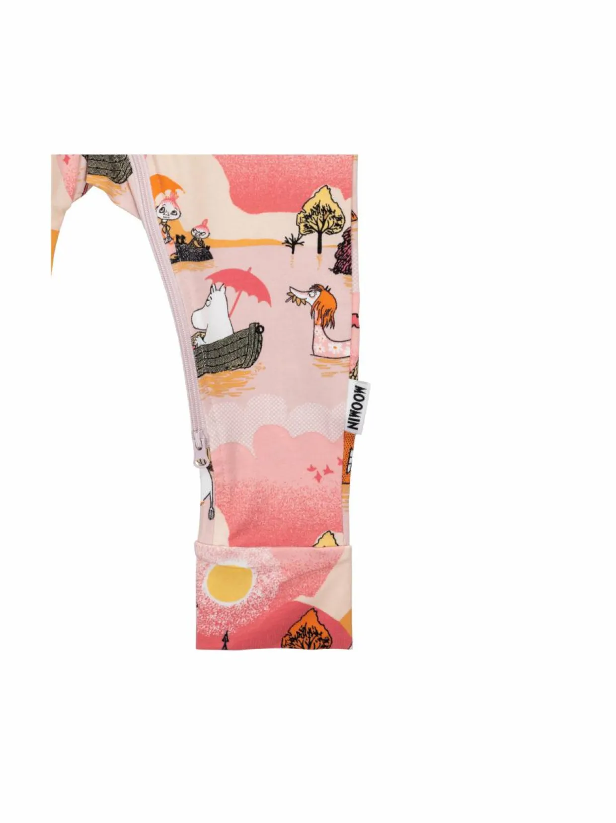 Vauvojen pitkähihainen pyjama, jossa on edessä vetoketju. Kaula-aukossa on lapsen kaulaa suojaava vetoketjusuojus. Pyjamaa koristaa vivahteikas muumikuosi. Lahkeissa on joustavat resorit. Materiaali on miellyttävän pehmeää ja joustavaa luomupuuvillatrikoota.