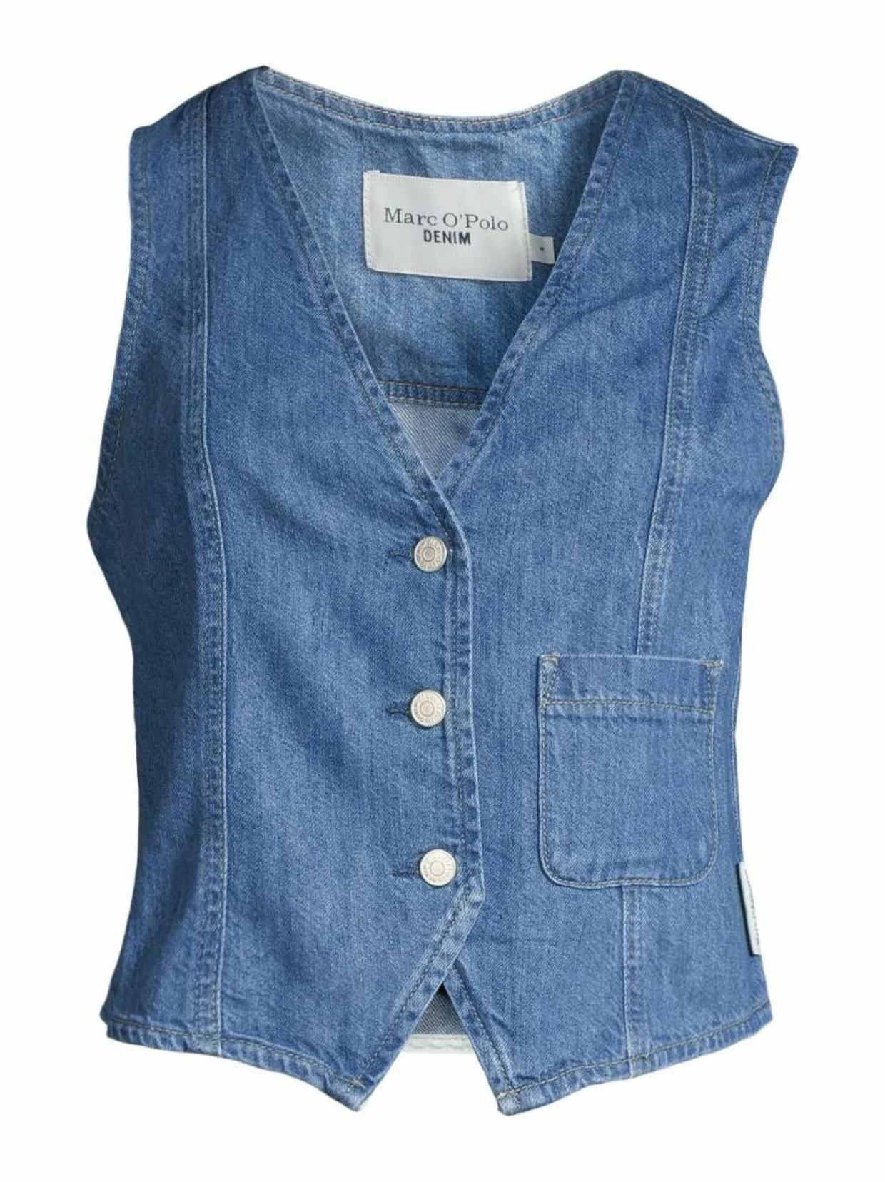 Lyhyt farkkuliivi, jonka hengittävä kangas yhdistää puuvillan, lyocellin ja pellavan. Edessä on napit ja pieni, käytännöllinen etutasku. Liivissä on rento istuvuus. Se on monikäyttöinen lisäys vaatekaappiin.