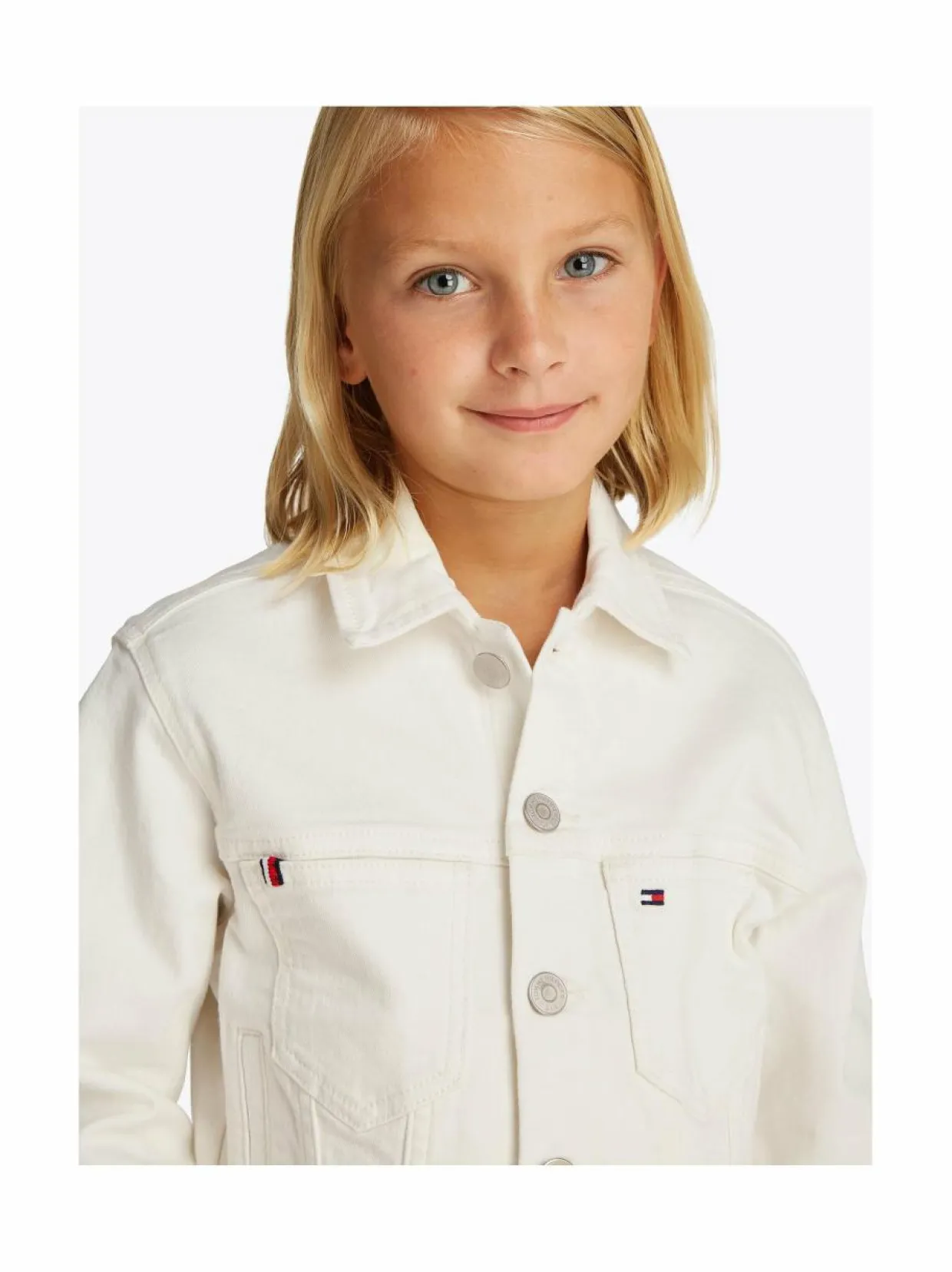 Lasten farkkutakki Tommy Hilfiger vaatemerkiltä. Tässä takissa on sivu- ja rintataskut. Edessä on klassinen logonappisulku. Logomerkit on sijoitettu rintataskujen päälle. Materiaalina on käytetty denimkangasta, johon on lisätty myös hieman elastaania tuomaan joustoa.