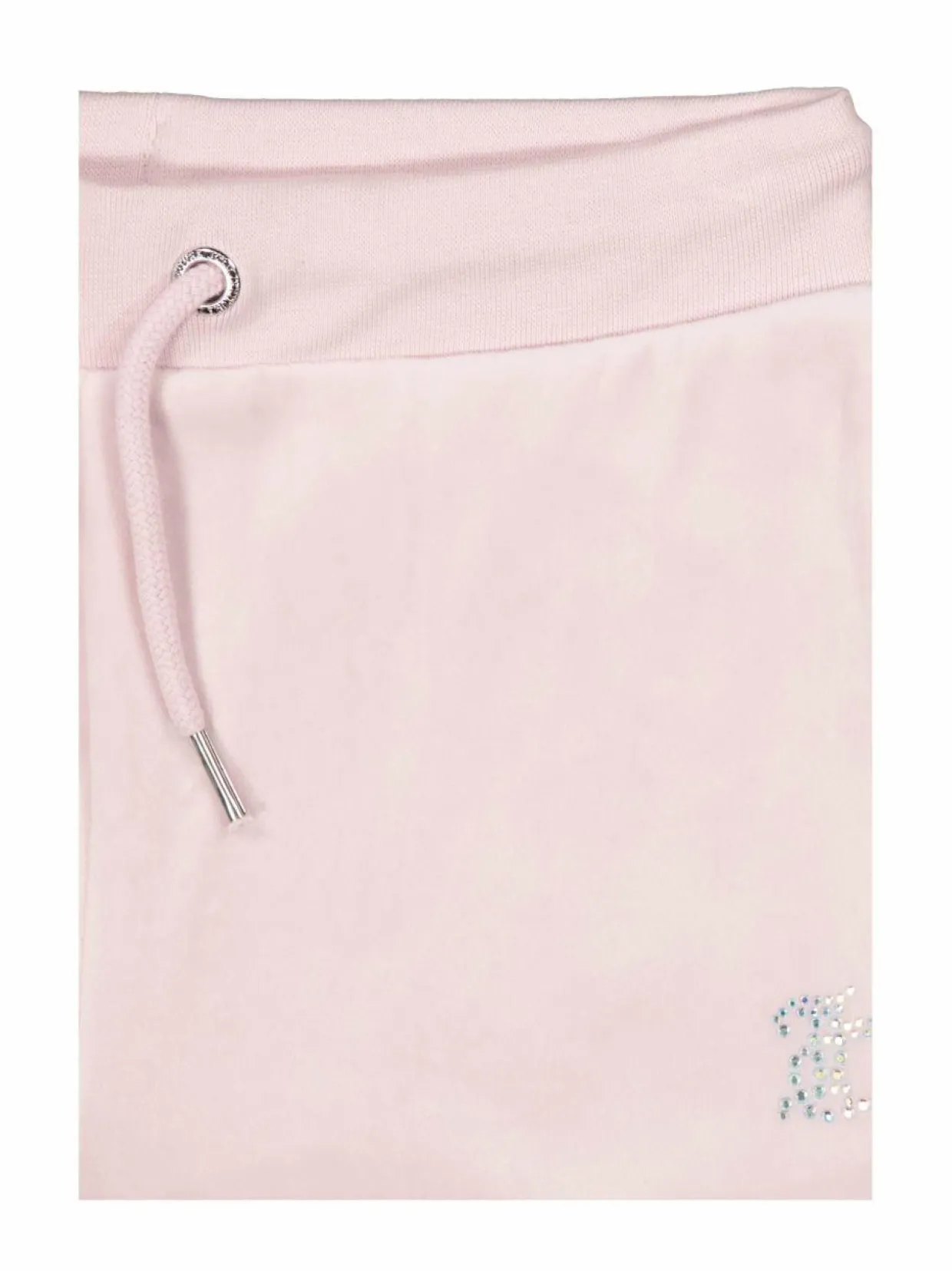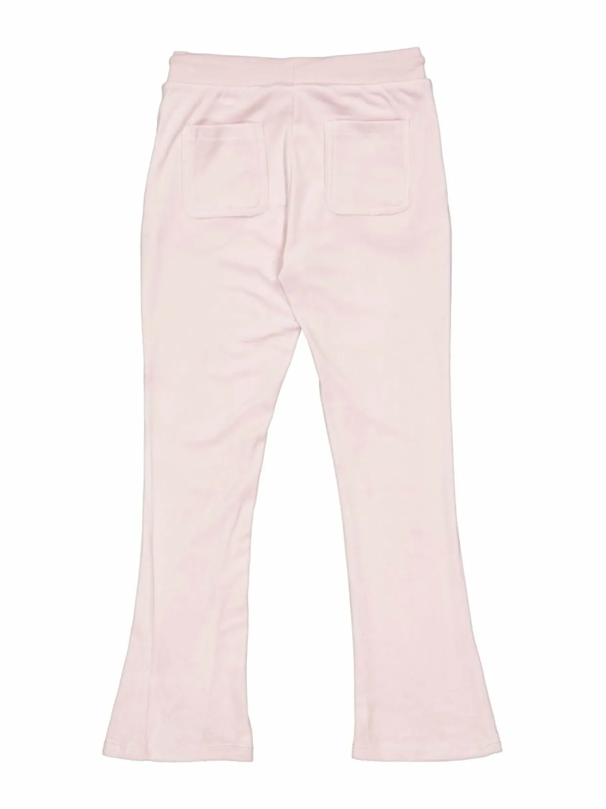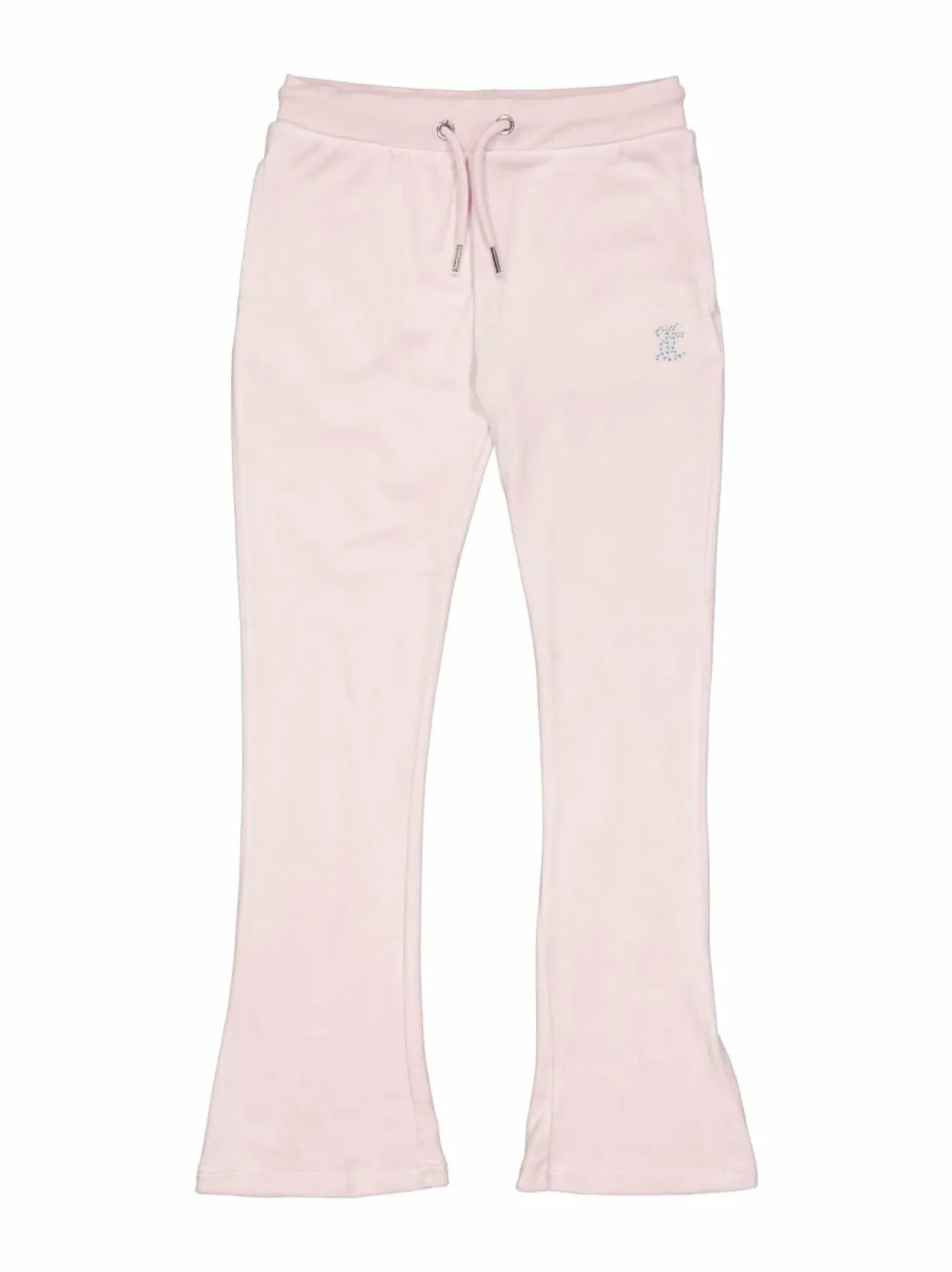 Pehmeät samettihousut Juicy Couture vaatemerkiltä. Näissä lasten leggingseissä on levenevät bootcut-malliset lahkeensuut ja säädettävä joustovyötärö. Tässä housumallissa on myös sivutaskut ja kimalteleva, strasseilla koristeltu logomerkki.