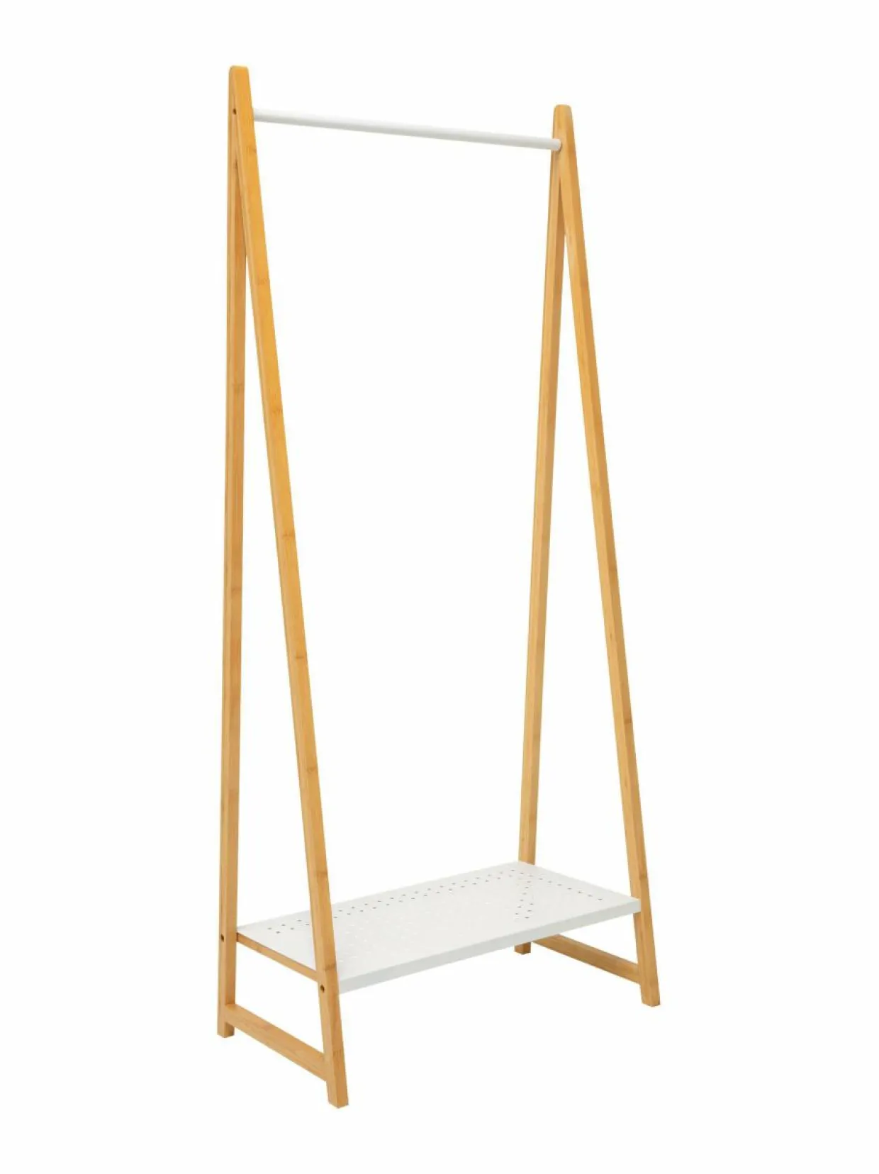 Dingla-vaatetelineessä voit säilyttää ja kuivattaa vaatteitasi ja kenkiäsi. Tyylikäs teline sopii niin eteiseen, makuuhuoneeseen kuin kodinhoitohuoneeseen. Vaaterekki koostuu metallitangosta, hyllystä ja bambujaloista. Korkeus on 146.5 cm, leveys 62 cm ja syvyys 36 cm.